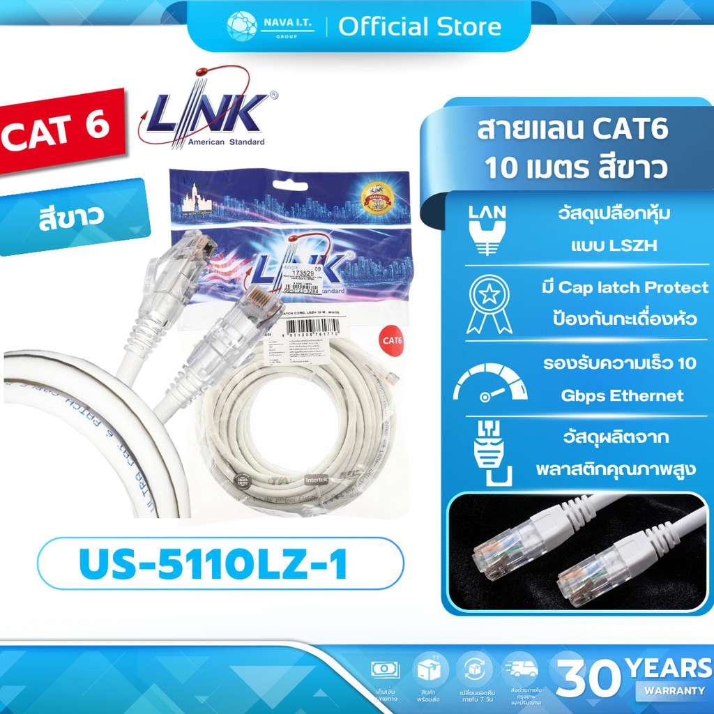 (มีส่งด่วน) LINK US-5110LZ-1 WHITE 10M CAT6 RJ45 PATCH CORD LSZH LAN CABLE รับประกัน30ปี