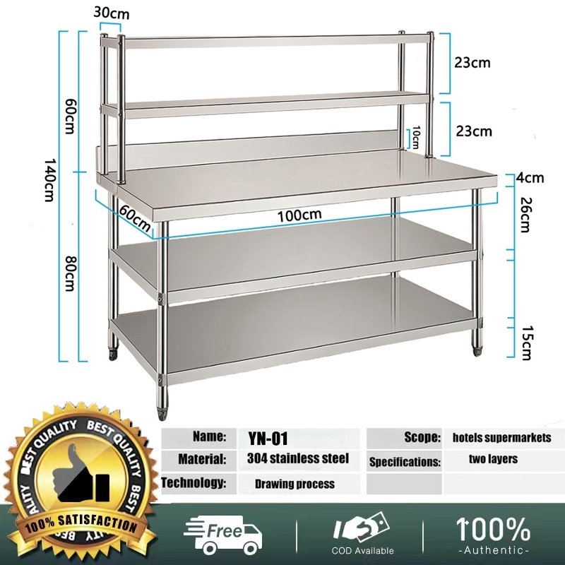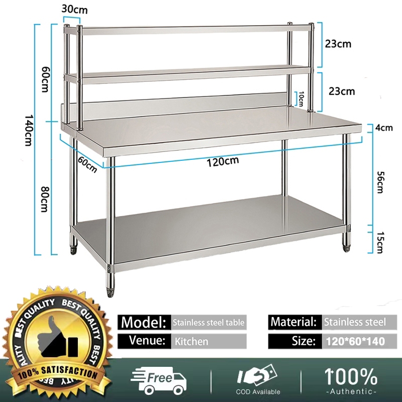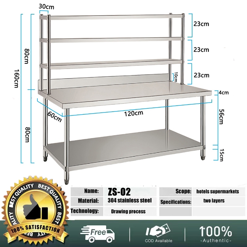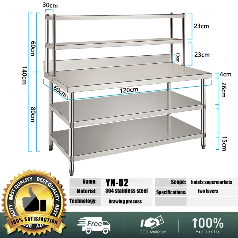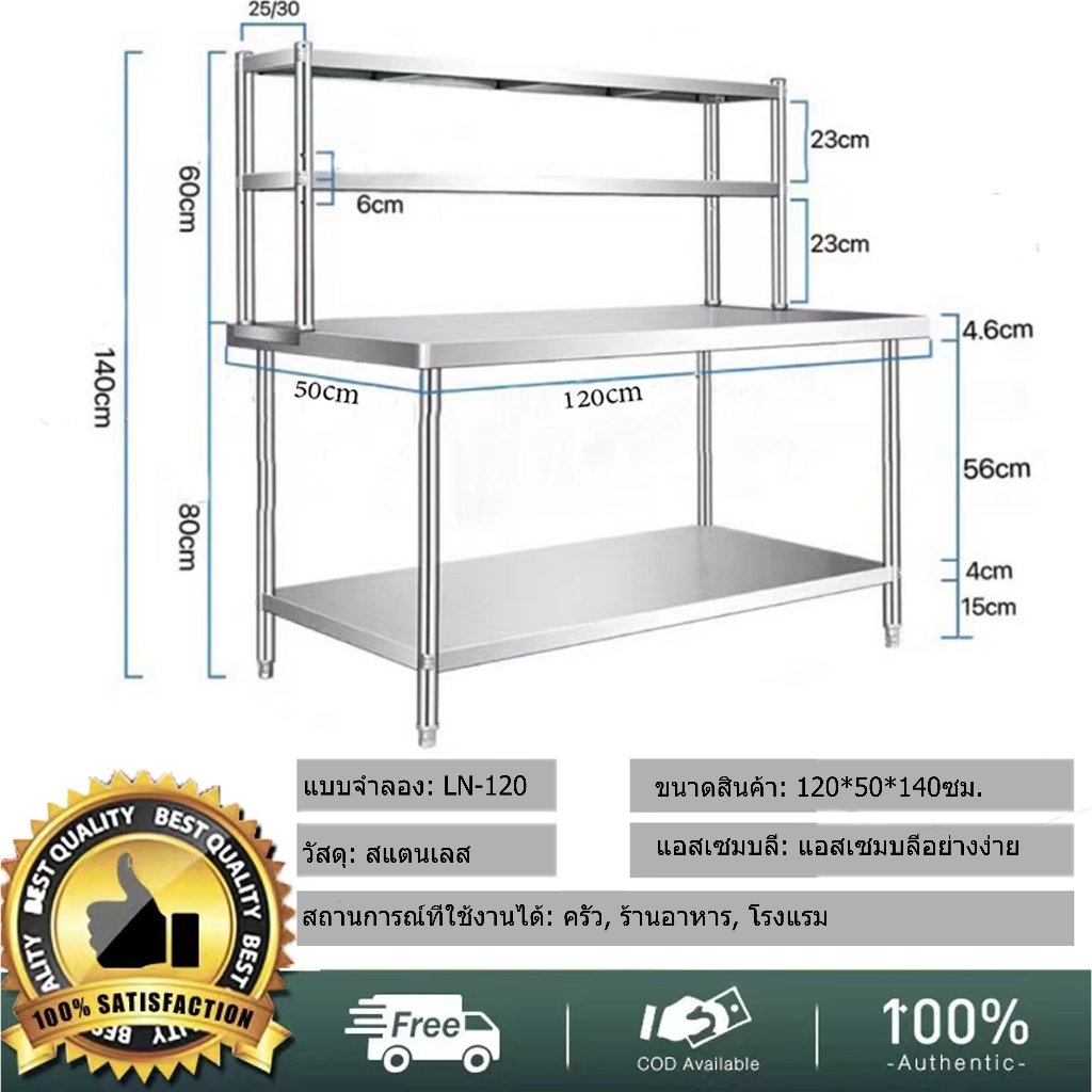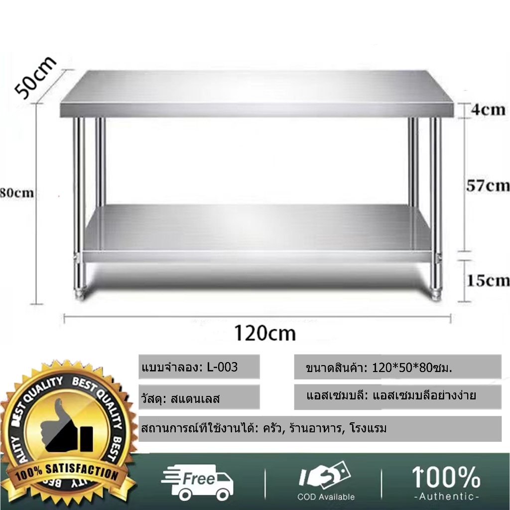 คุณภาพสูง โต๊ะทำงาน 304 stainless steel table ขอบล้อม ทำความสะอาดง่าย โต๊ะสองชั้น โต๊ะ 120CM×50CM×80CM โต๊ะสแตนเลส
