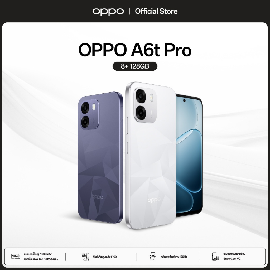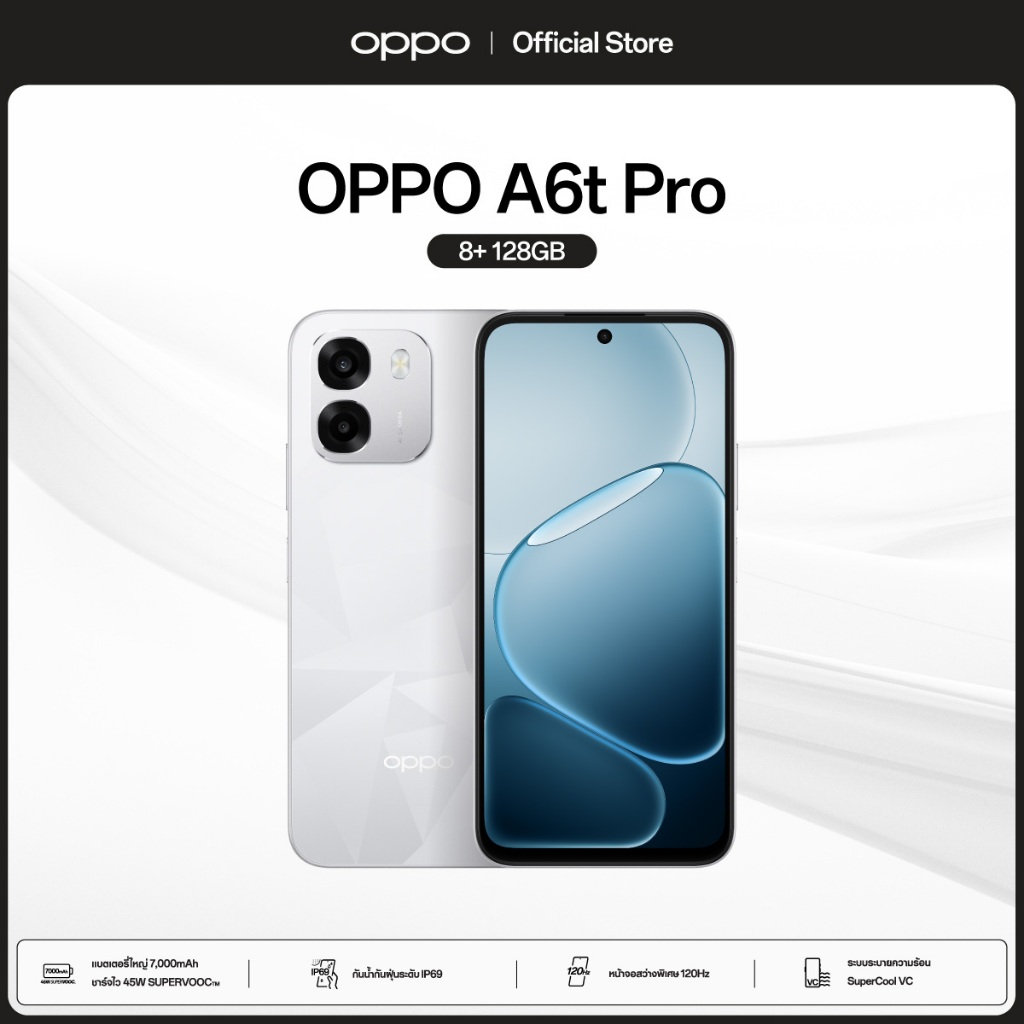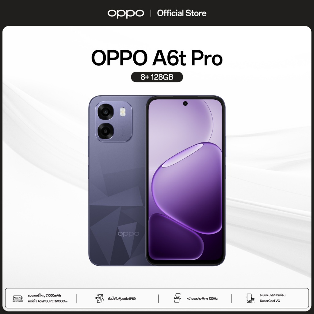 [New] OPPO A6t Pro(8+128G) โทรศัพท์มือถือ แบต 7,000mAh ชาร์จไว 45W SUPERVOOC กันน้ำกันฝุ่น IP69 ระบายความร้อน SuperCool