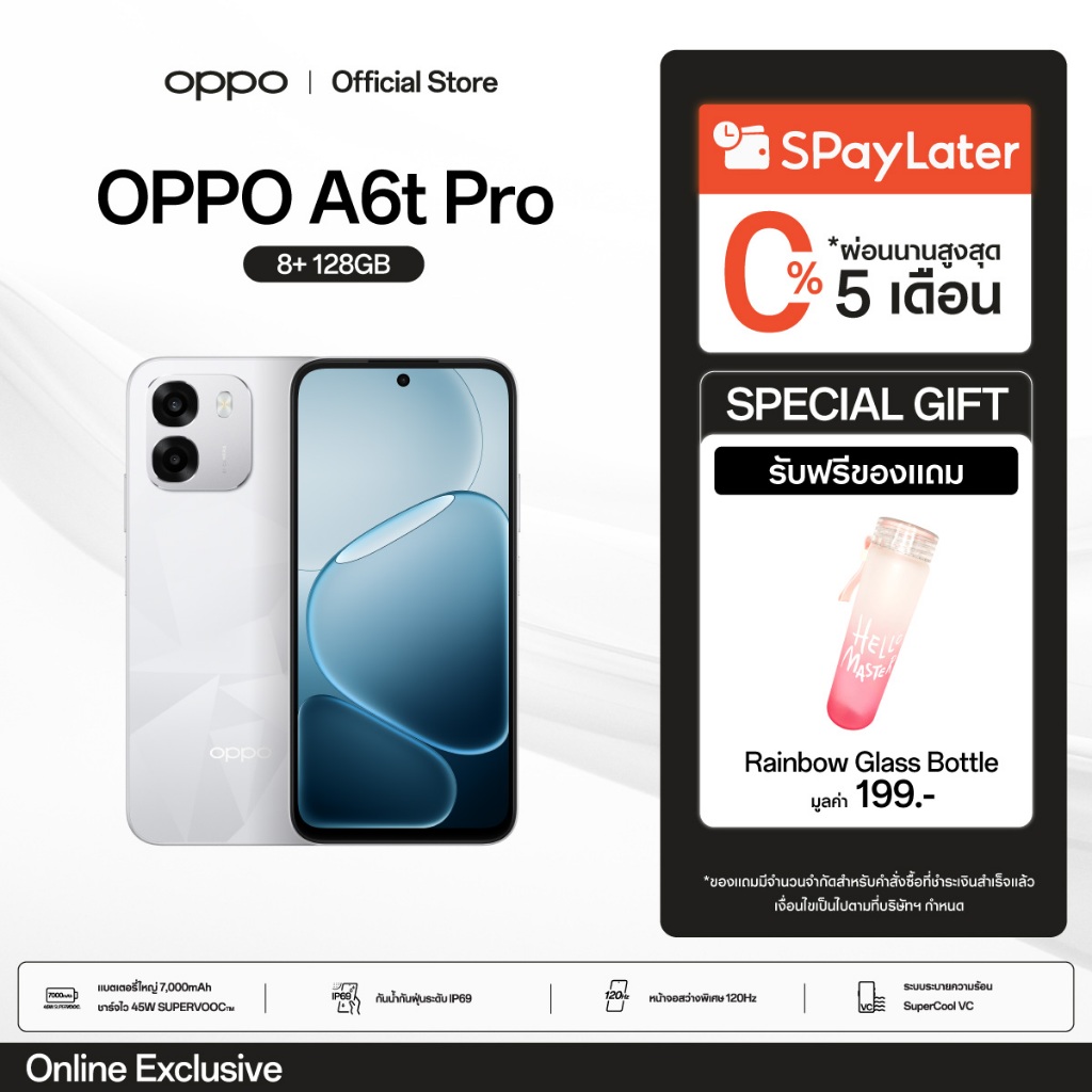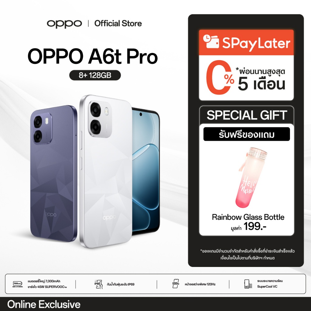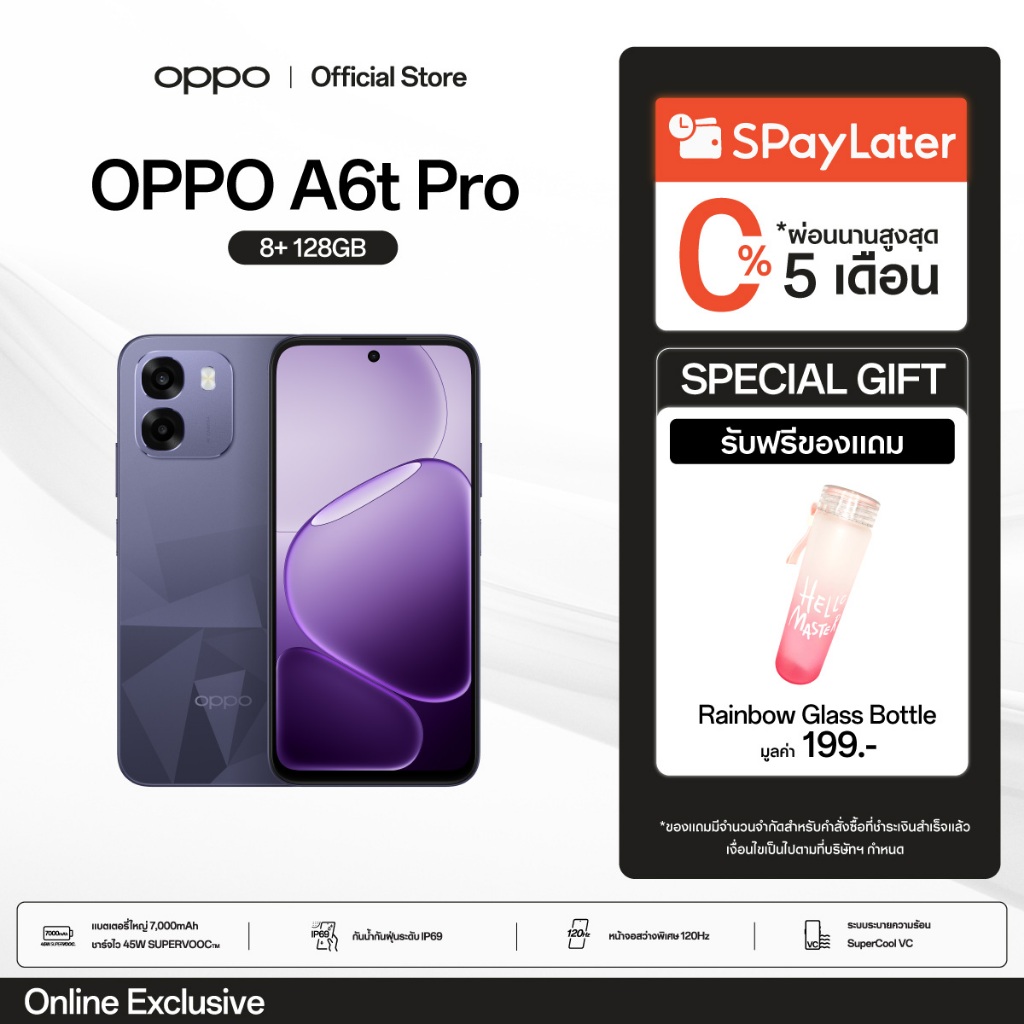[New] OPPO A6t Pro(8+128G) โทรศัพท์มือถือ แบต 7,000mAh ชาร์จไว 45W SUPERVOOC กันน้ำกันฝุ่น IP69 ระบายความร้อน SuperCool