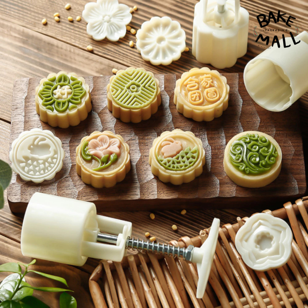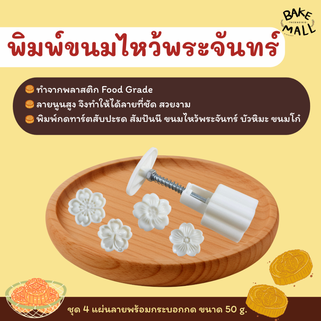 พิมพ์กดไหว้ขนมพระจันทร์ ขนาด 50 g. ลายดอก 4 แบบ ขนาดดอก 4.5cm. พิมพ์กดขนมบัวหิมะ พลาสติก Food Grade