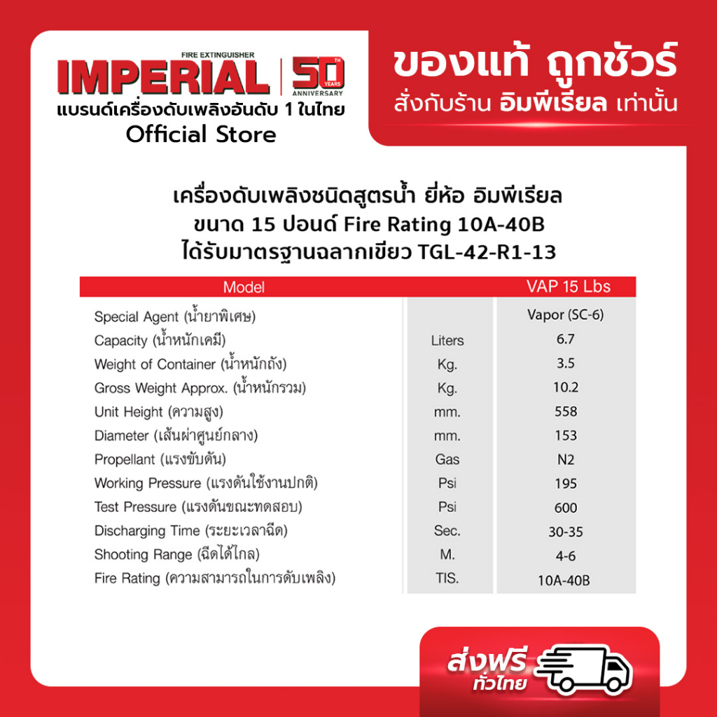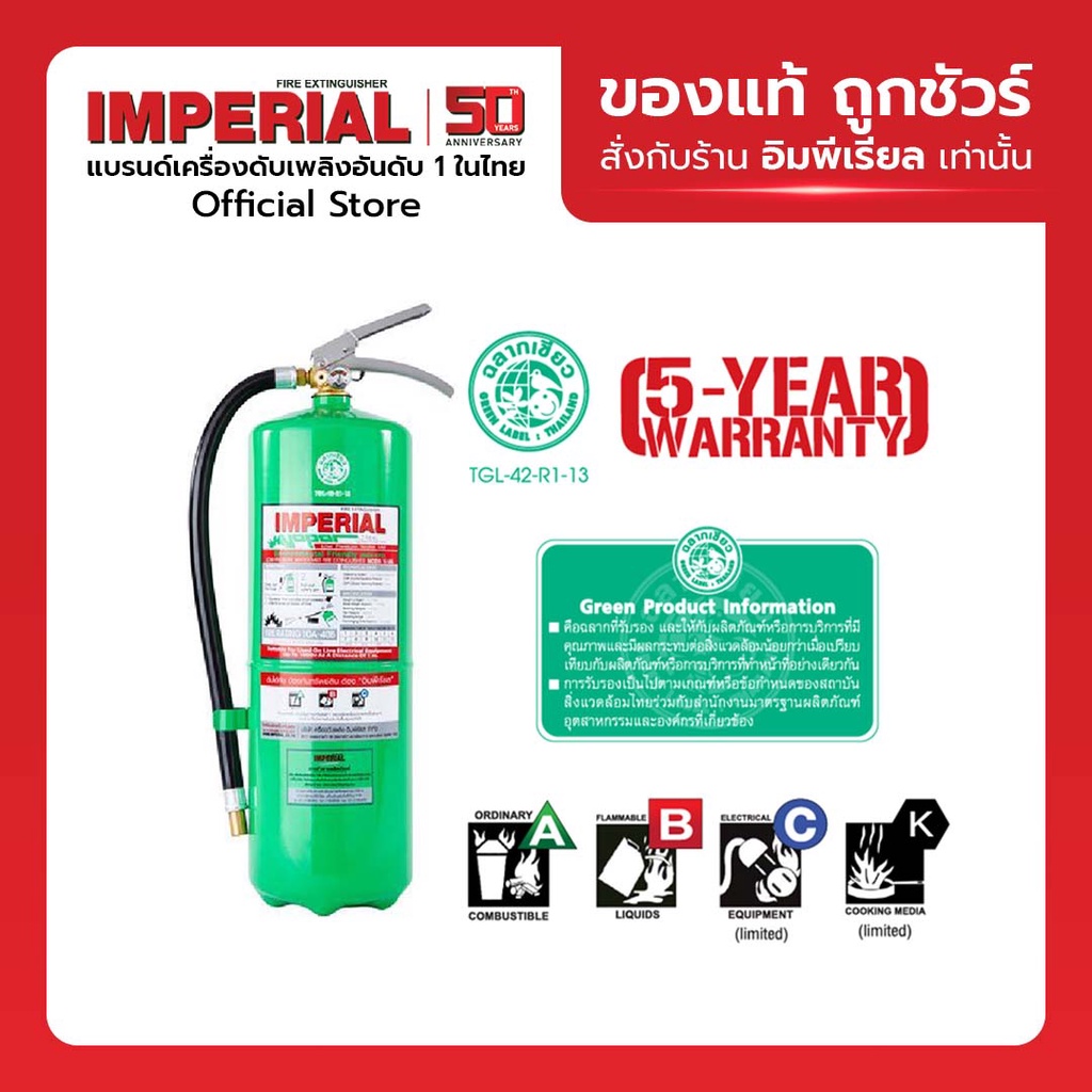เครื่องดับเพลิง ถังดับเพลิงอิมพีเรียล ชนิดสูตรน้ำ เวเปอร์ ขนาด 15 ปอนด์ Fire Rating 10A-40B ได้รับมาตรฐานฉลากเขียว