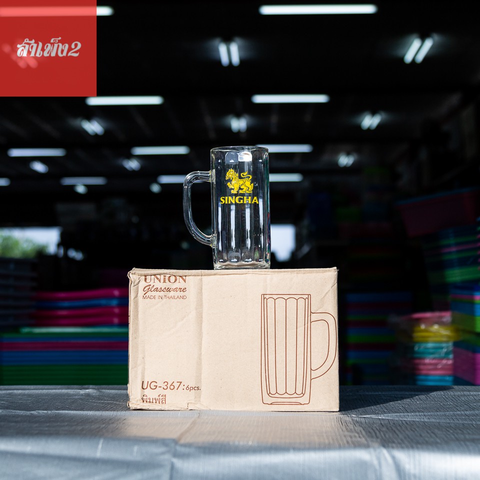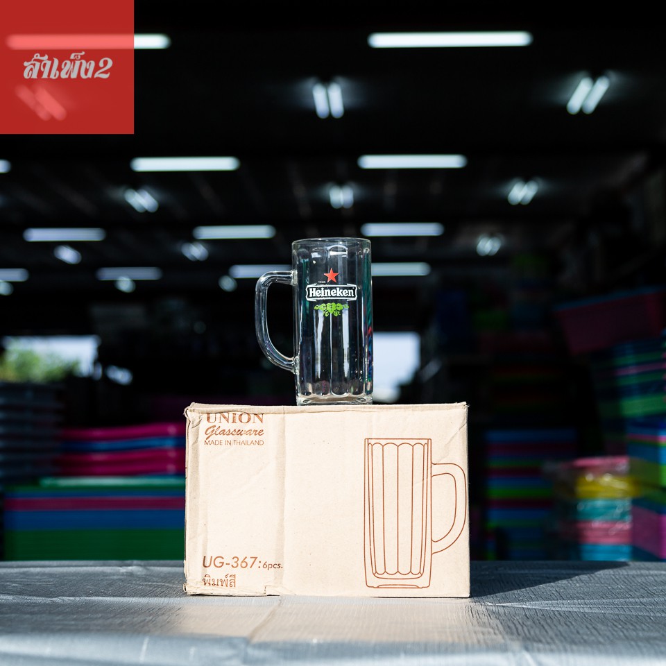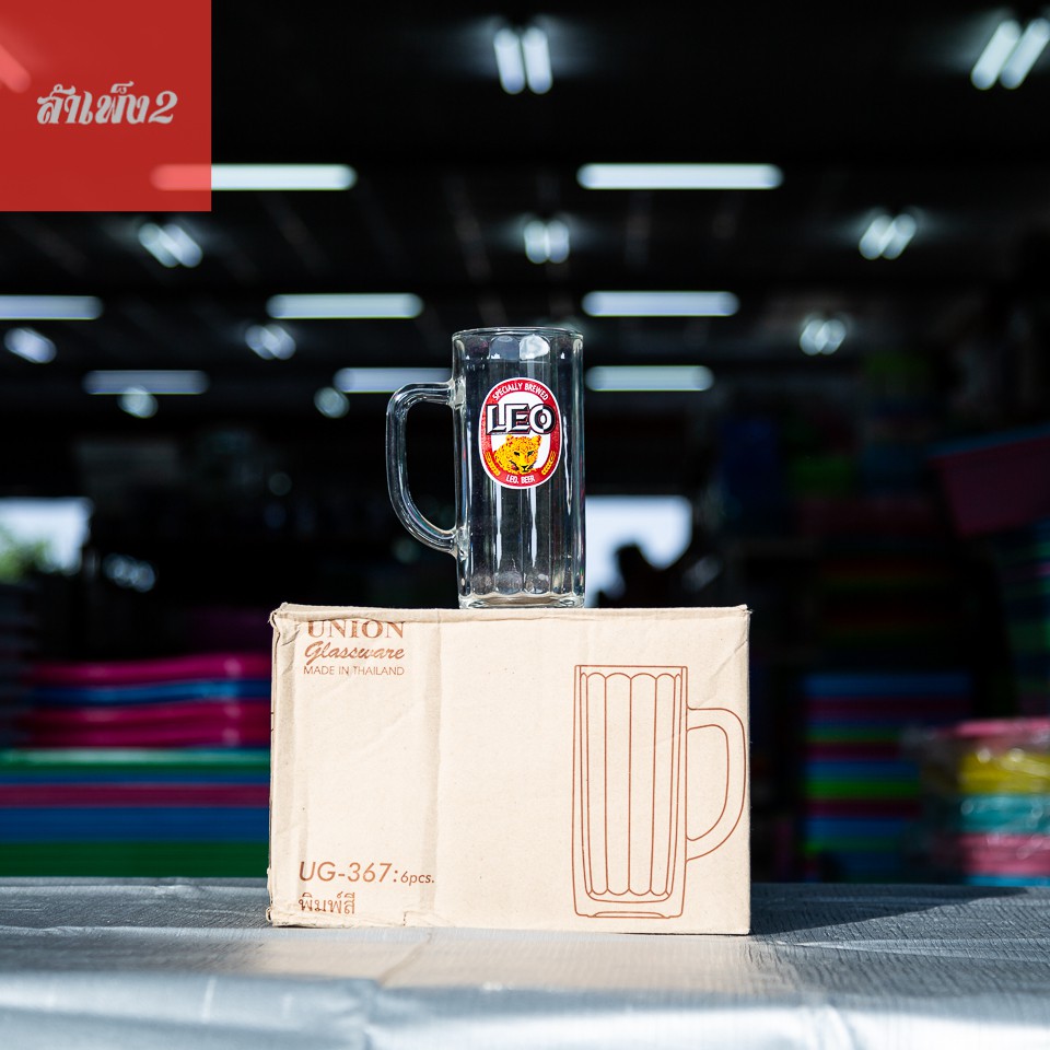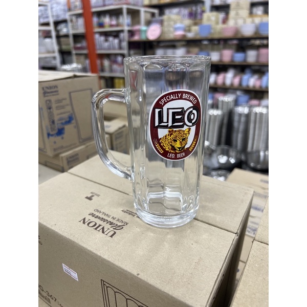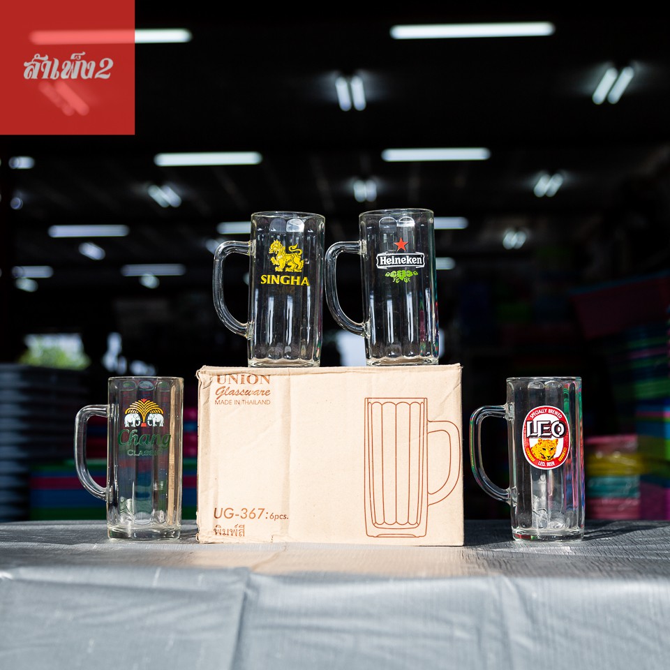 [ร้านสำเพ็ง2] UG-367 แก้วมีหูใสทรงเหยือก แก้วเบียร์ น้ำ พิมพ์ลาย สิงห์ ช้าง ลีโอ ไฮเนเก้น แพ็ค6ใบ Union glassware