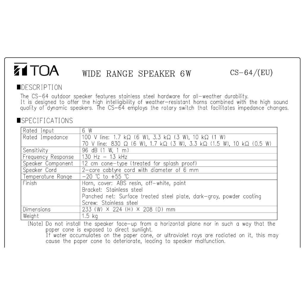 TOA CS-64 - ลำโพงกลางแจ้ง ใช้ได้ทุกสภาพอากาศ ชนิดมุมกว้าง ขนาด 6 วัตต์