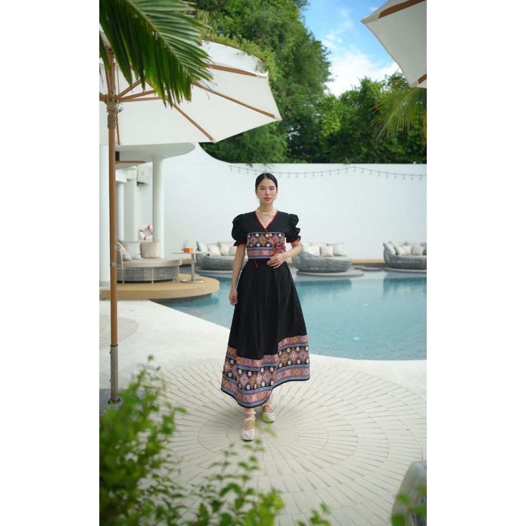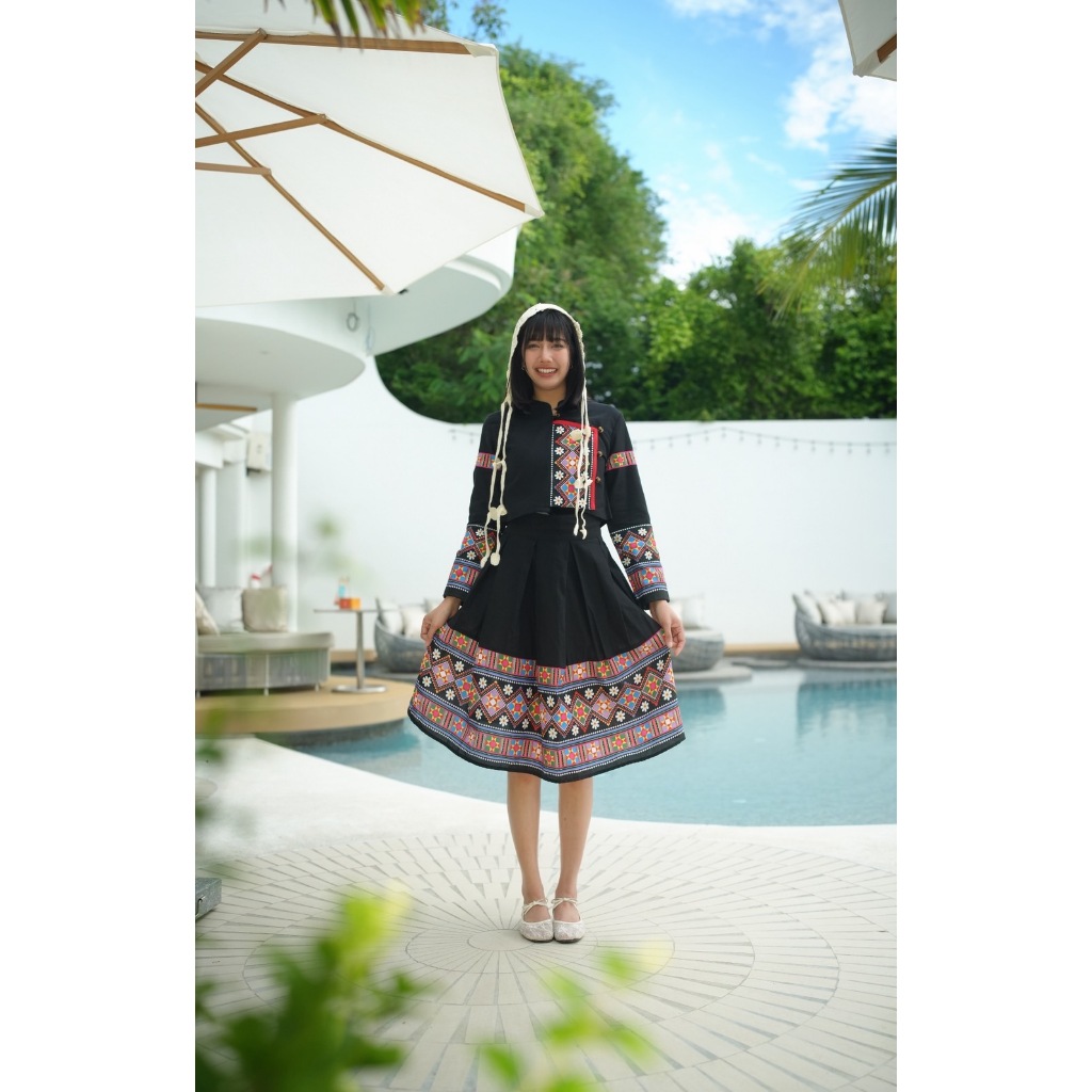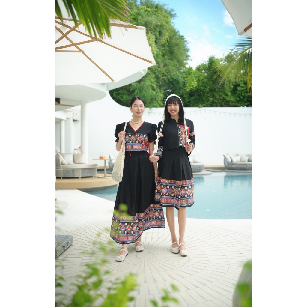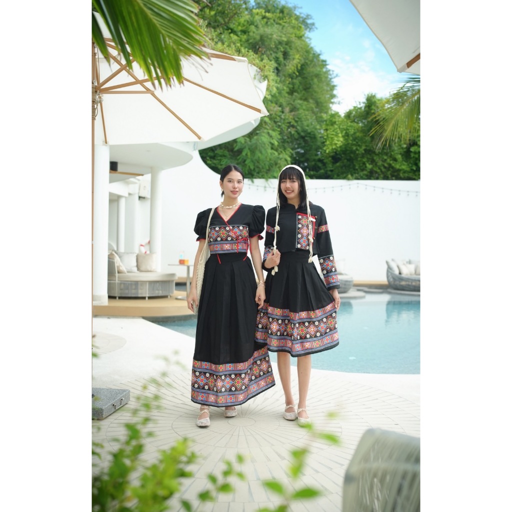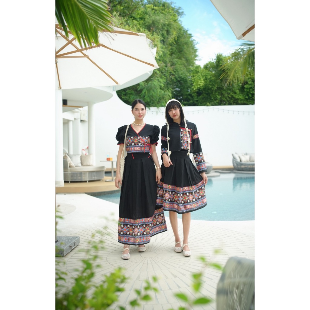 เซ็ทลายลาหู่(มูเซอดำ)เสื้อคอจีนกระโปรงสั้นและเสื้อมัดข้างกระโปรงยาวผ้าโพลี่เอสเตอร์พิมพ์ลาย