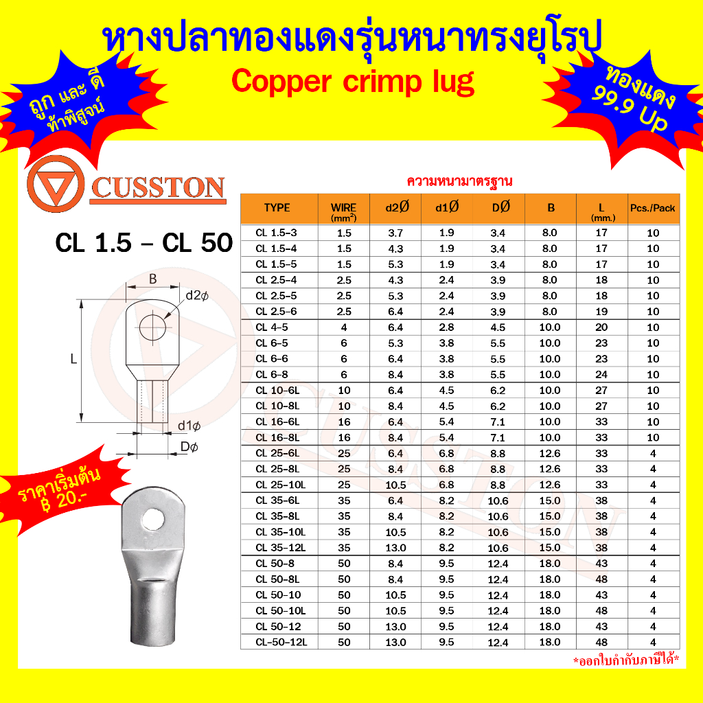 หางปลาทองแดงรุ่นหนา ทรงยุโรป ขนาด 1.5 - 50 Sq.mm.