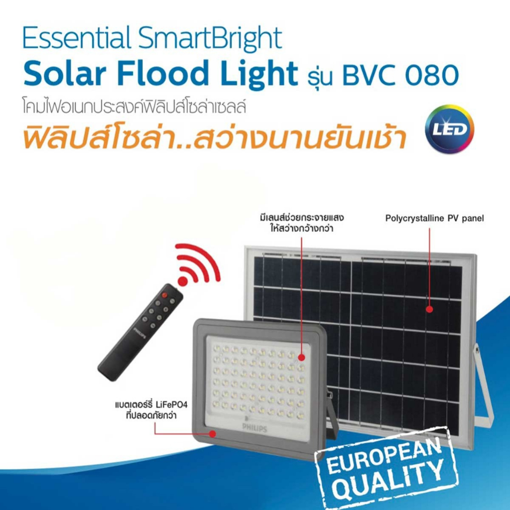 Philips โคมสปอร์ตไลท์โซล่าเซลล์ ฟิลลิป Solar FloodLight รุ่น BVC080 60W 90W 150W โคมไฟและแผงโซลาร์เซลล์ อุปกรณ์ติดตั้ง
