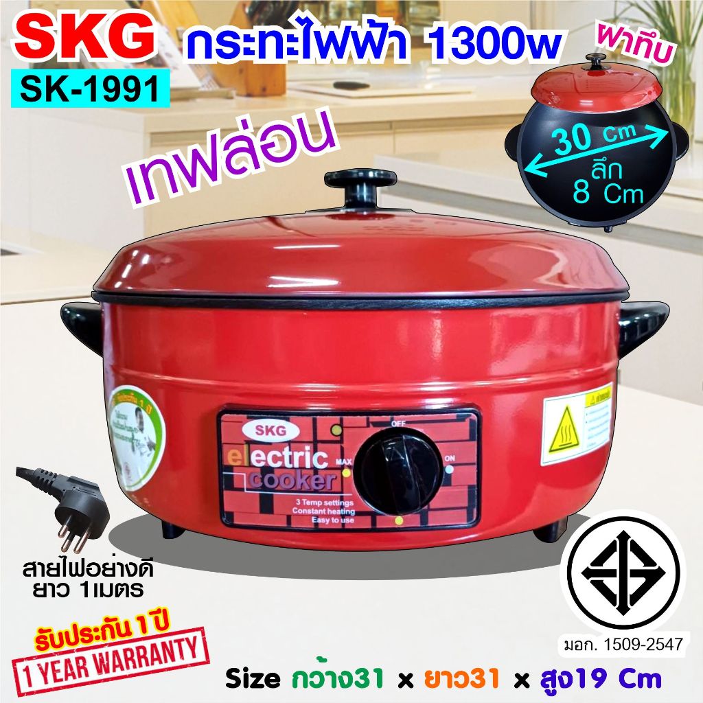 SKG กระทะ ไฟฟ้า อเนกประสงค์ 12นิ้ว 1000w/1300w เลือกรุ่น SK-1881 (สีแดง อลูมิเนียม ฝาใส) SK-1991 (สีแดง เทฟล่อน ฝาทึบ)
