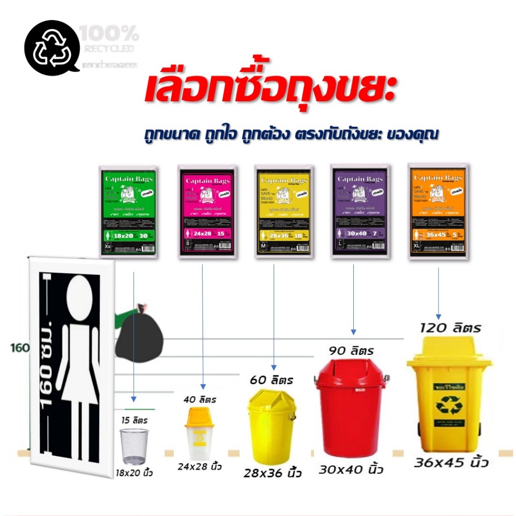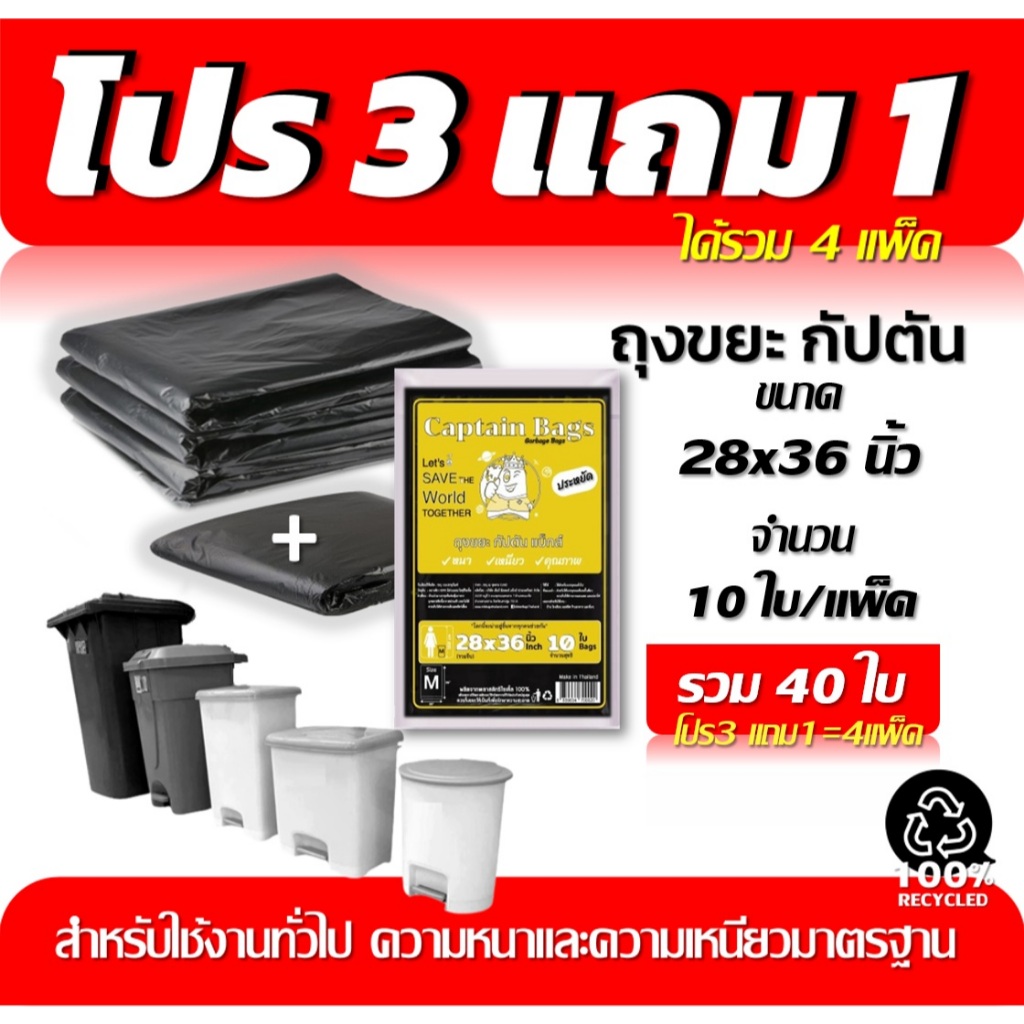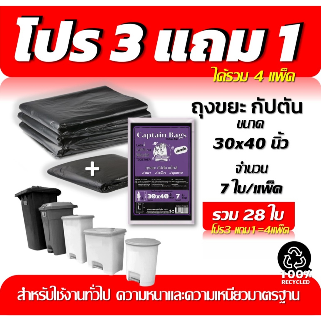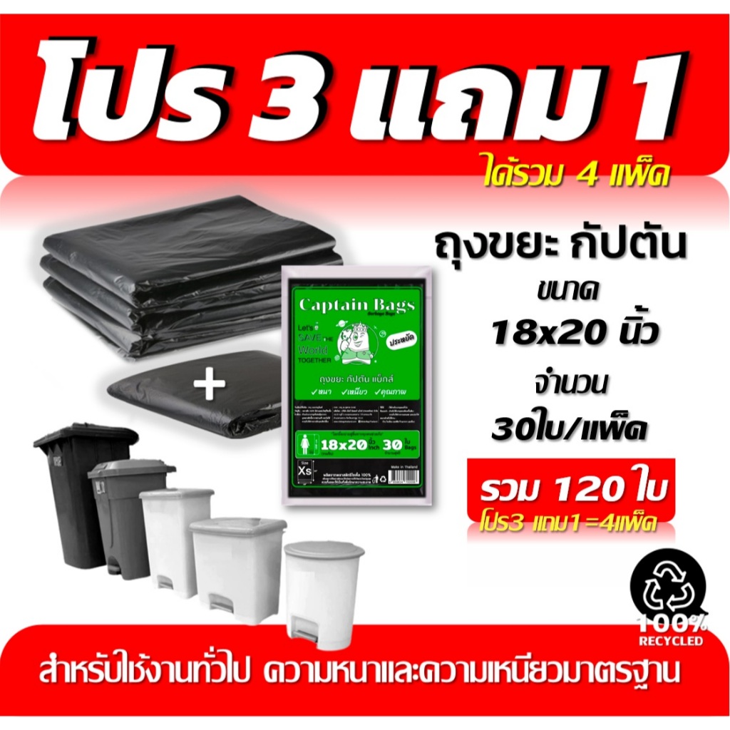 ถุงขยะ3แถม1(ได้4แพ็ค) ถุงขยะดำ ถุงขยะกัปตัน รีไซเคิล100% เนื้อเหนียว 5 ขนาดให้เลือก