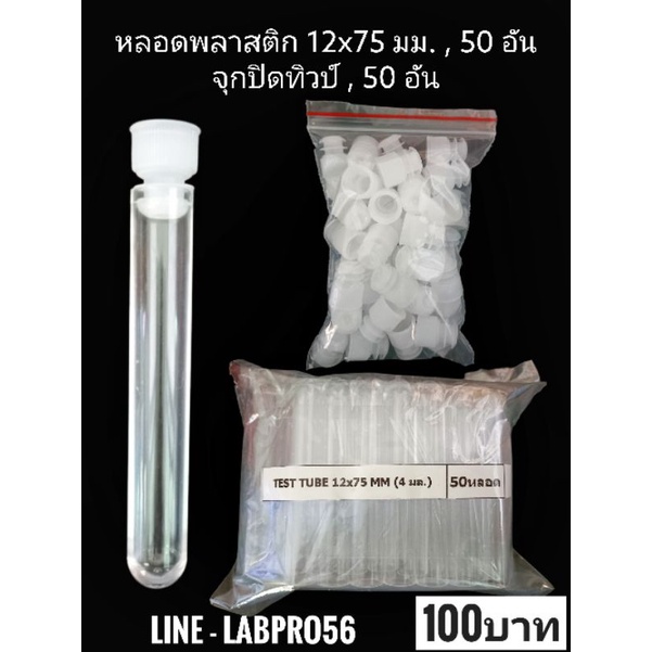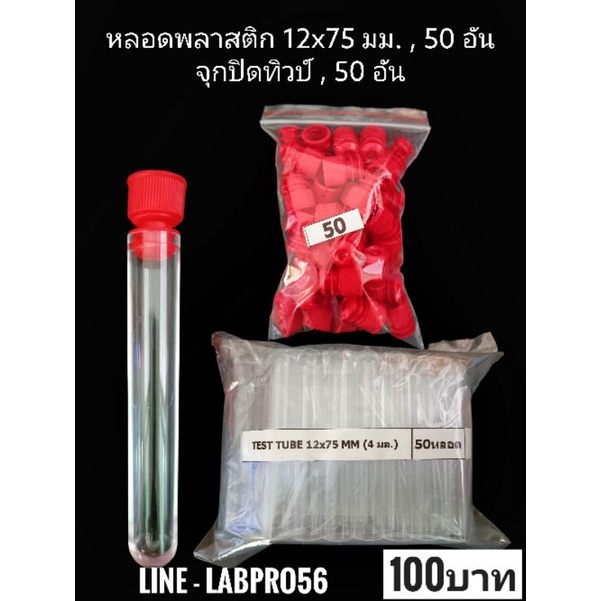 Tubeหลอดทดลองพลาสติก + จุกปิดทิวป์ 50ชุด ,12x75 มม. ทิวป์ , Plain Tube