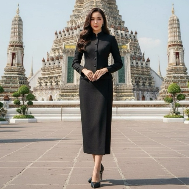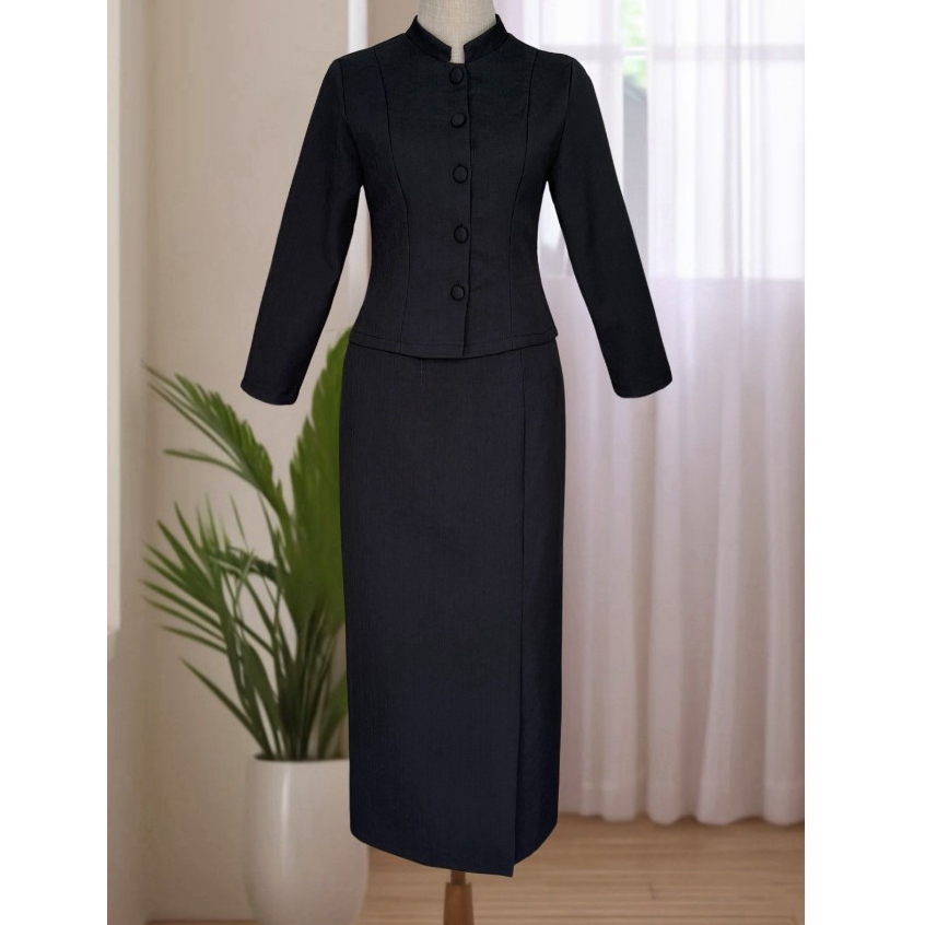 [พร้อมส่ง] ชุดสีดำ ชุดไทยจิตรลดา กระดุมหน้า เสื้อแขนยาว+กระโปรงยาว มีซับใน ผ้าไหมญี่ปุ่น ชุดเซ็ท2ชิ้น