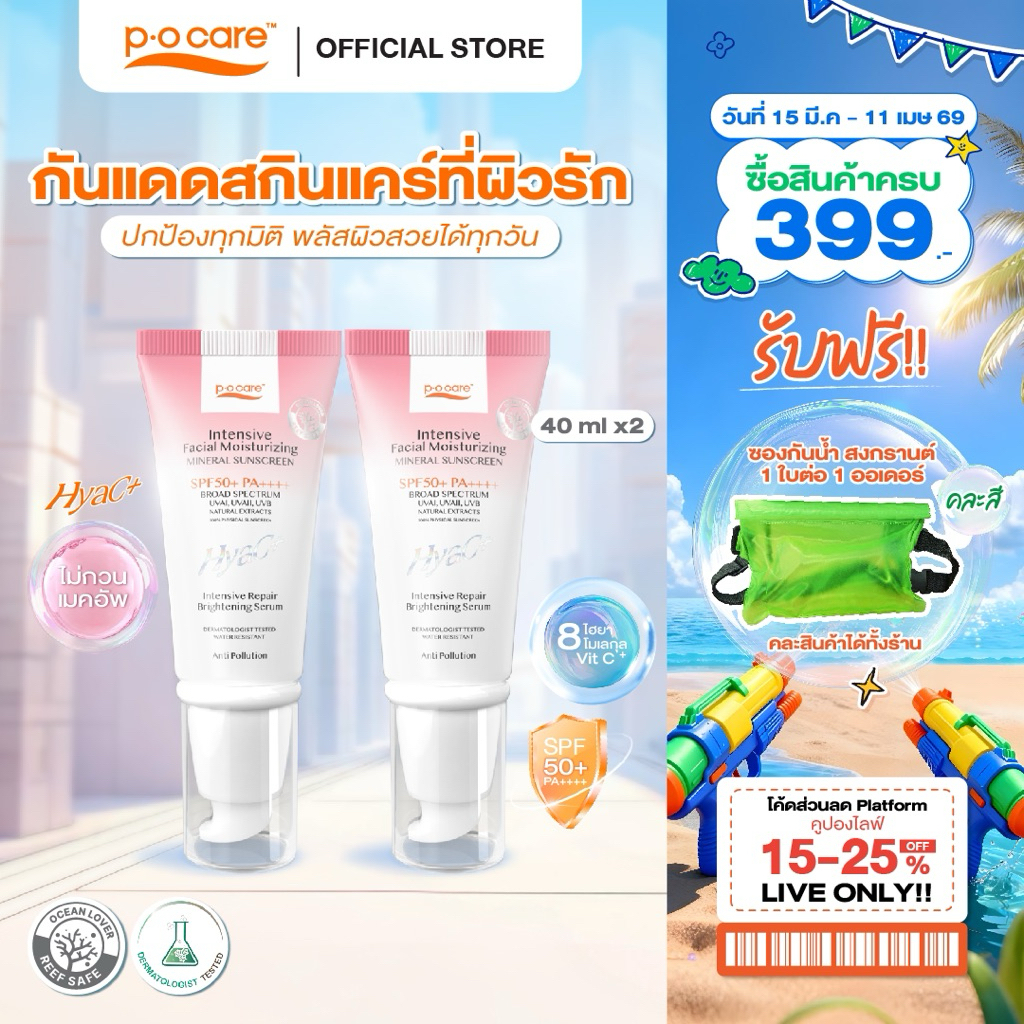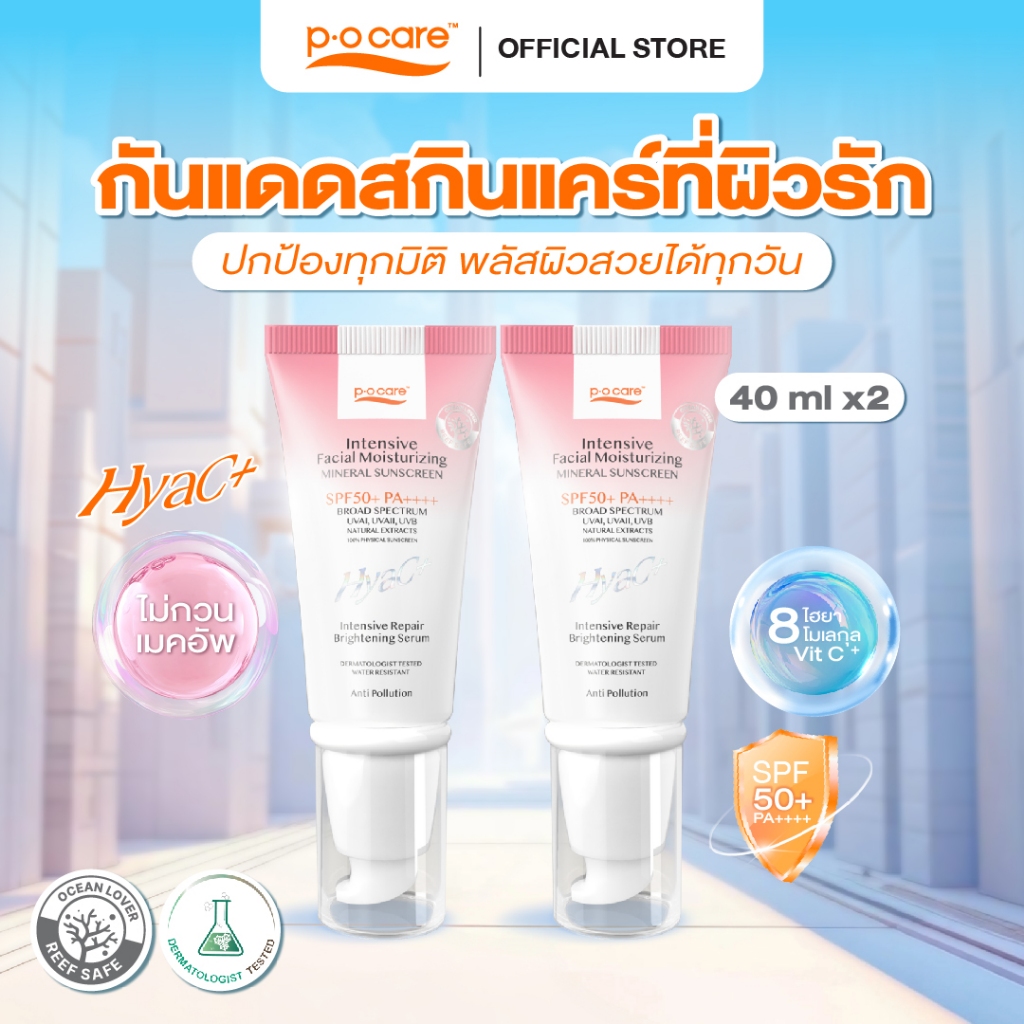 [แพ็กคู่] POCARE HYAC+ SUNSCREEN SPF50+ PA++++ 40 ml. กันแดดหน้าพีโอแคร์ ไฮยาซีพลัส ผิวแพ้ง่ายใช้ได้ กันน้ำ