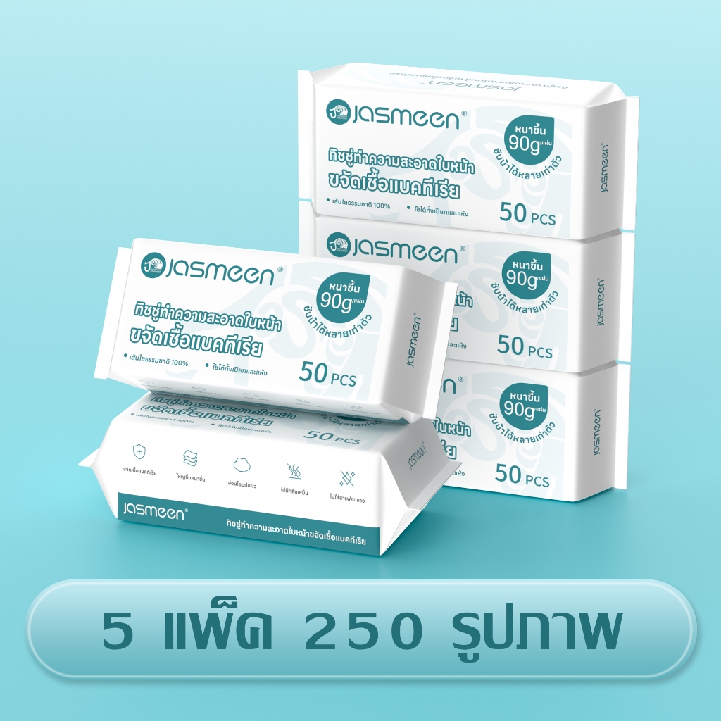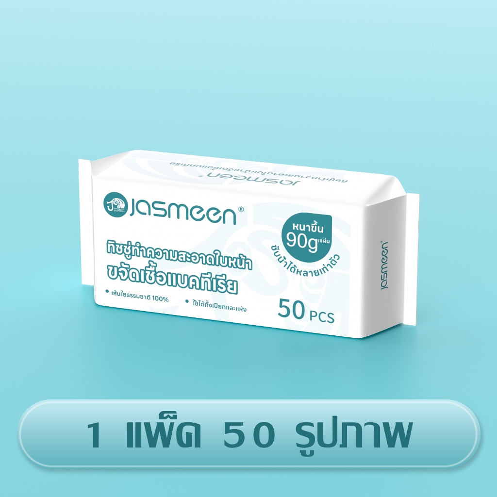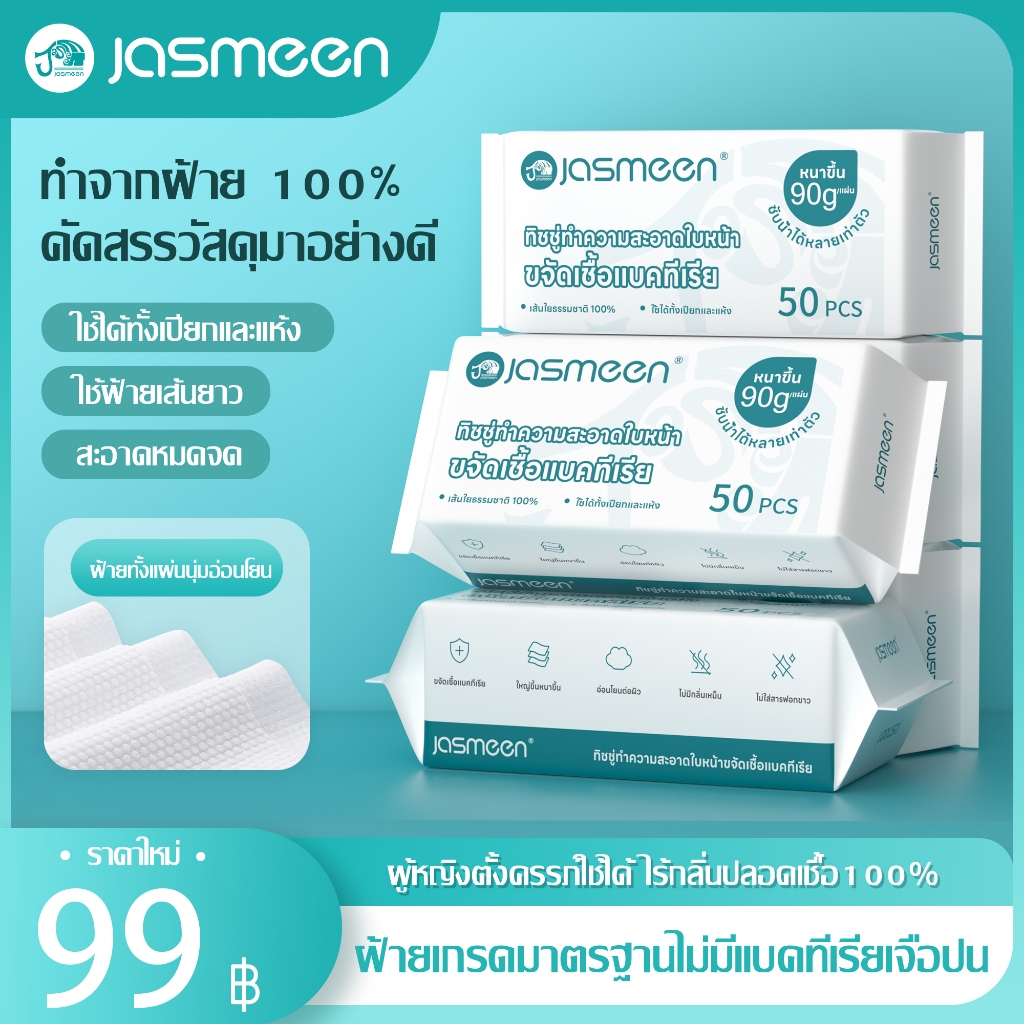 [50 pcs] Jasmeen ทิชชู่เช็ดหน้าผ้าฝ้าย 100% ผ้าขนหนูเช็ดหน้า ผ้าฝ้ายแท้แบบใช้แล้วทิ้งหนาลายมุกแต่งหน้า