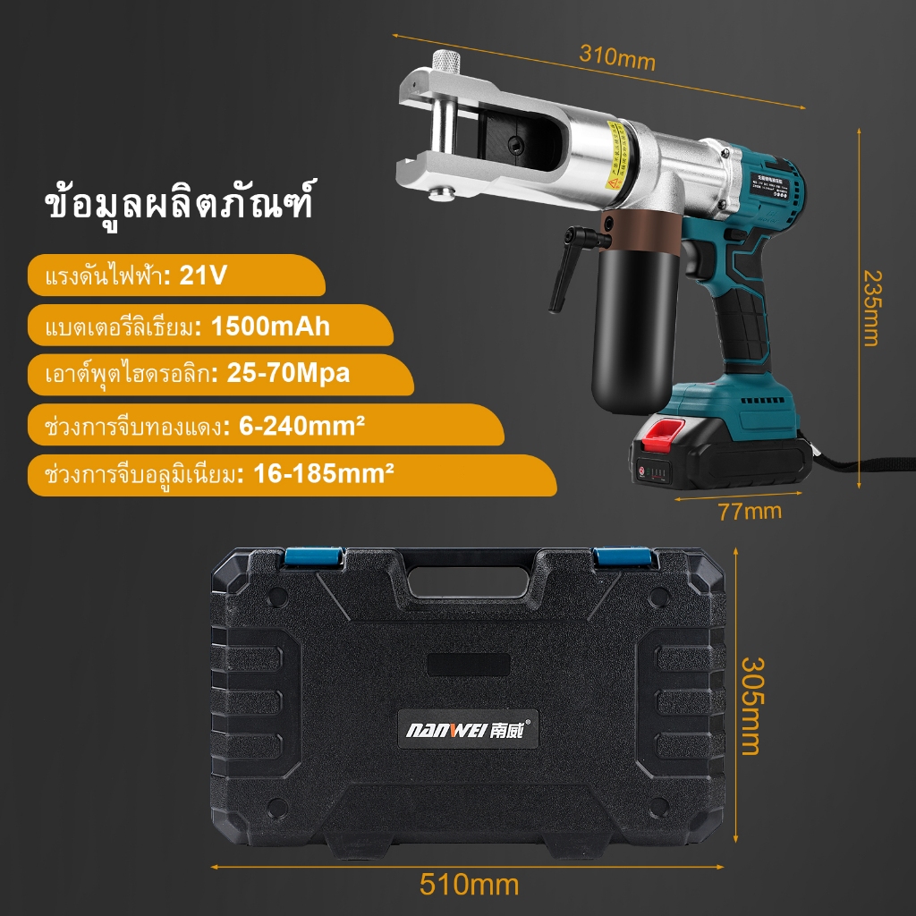 110MPa คีมย้ำไฟฟ้า คีมไฮดรอลิกเกรดอุตสาหกรรม คีม ย้ำหางปลา มอเตอร์ไร้แปรงถ่าน ช่วงการย้ำ10-240 มม.² ฟรีแม่พิมพ์ย้ำ 11อัน