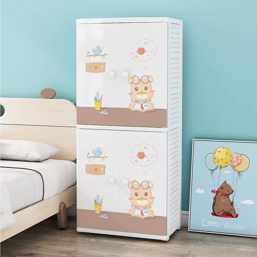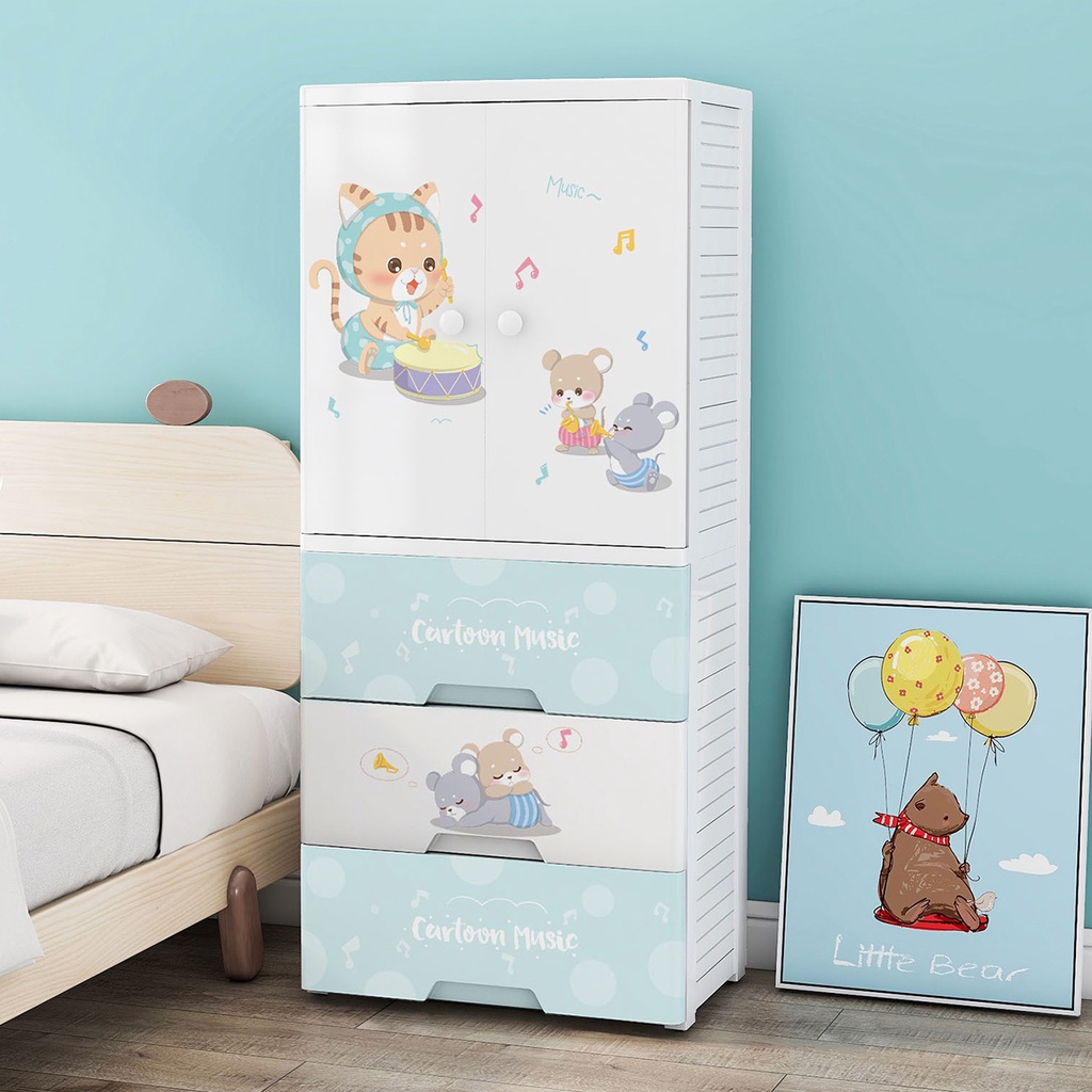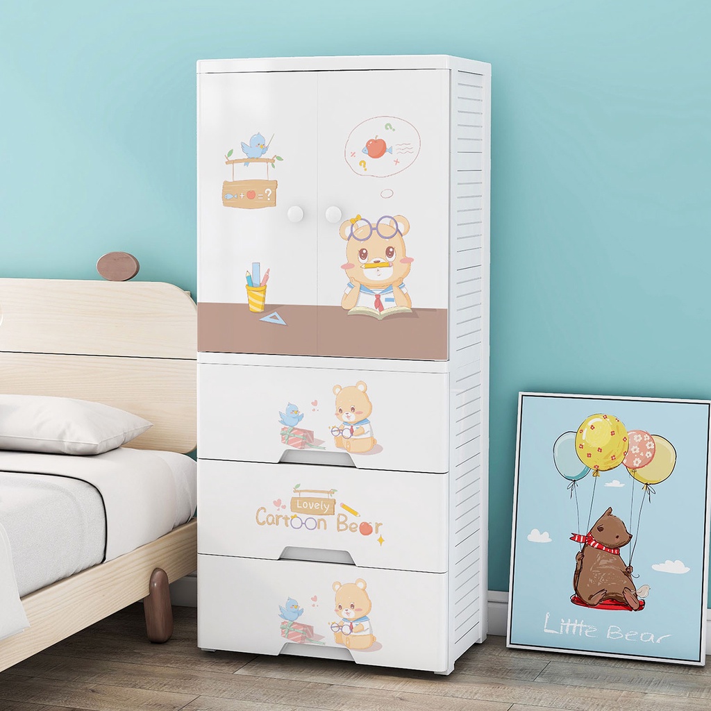 HEINOตู้เสื้อผ้าลายการ์ตูนเด็กที่เก็บของประตูคู่พร้องลิ้นชัก พร้อมล้อเลื่อน เป็นมิตรกับสิ่งแวดล้อม ไม่มีกลิ่น ปลอดสารพิษ