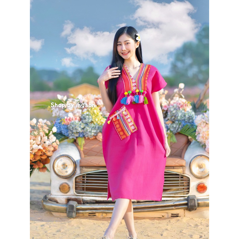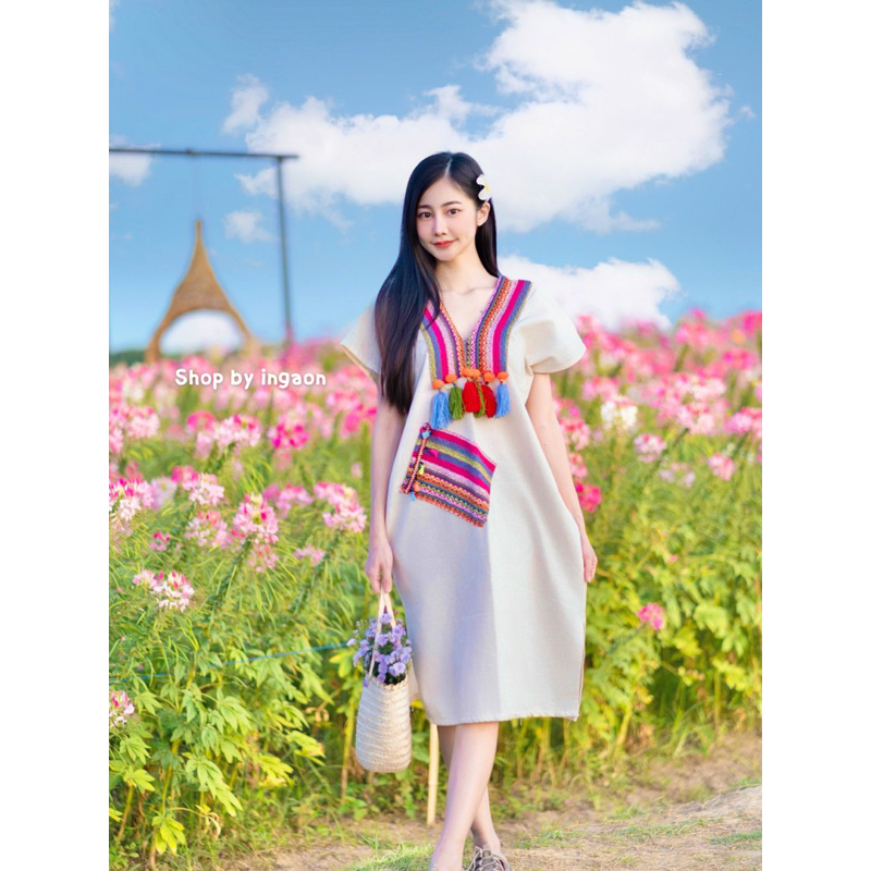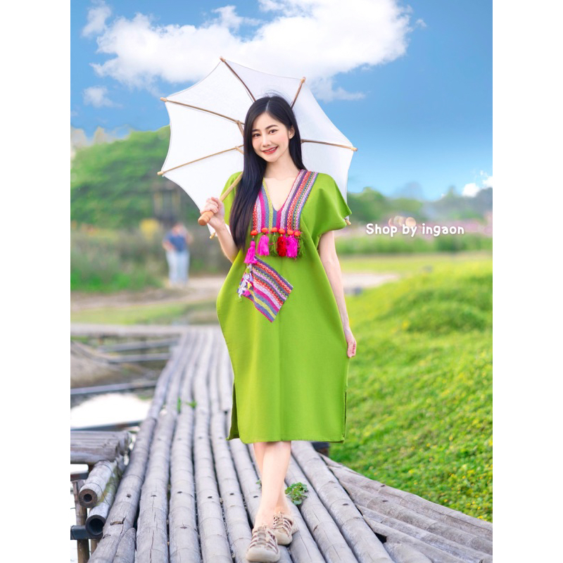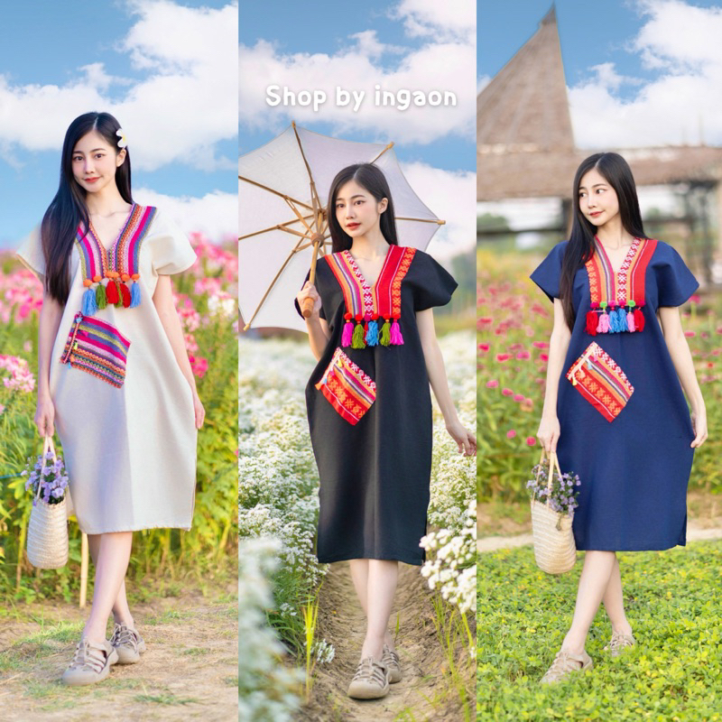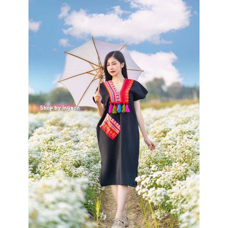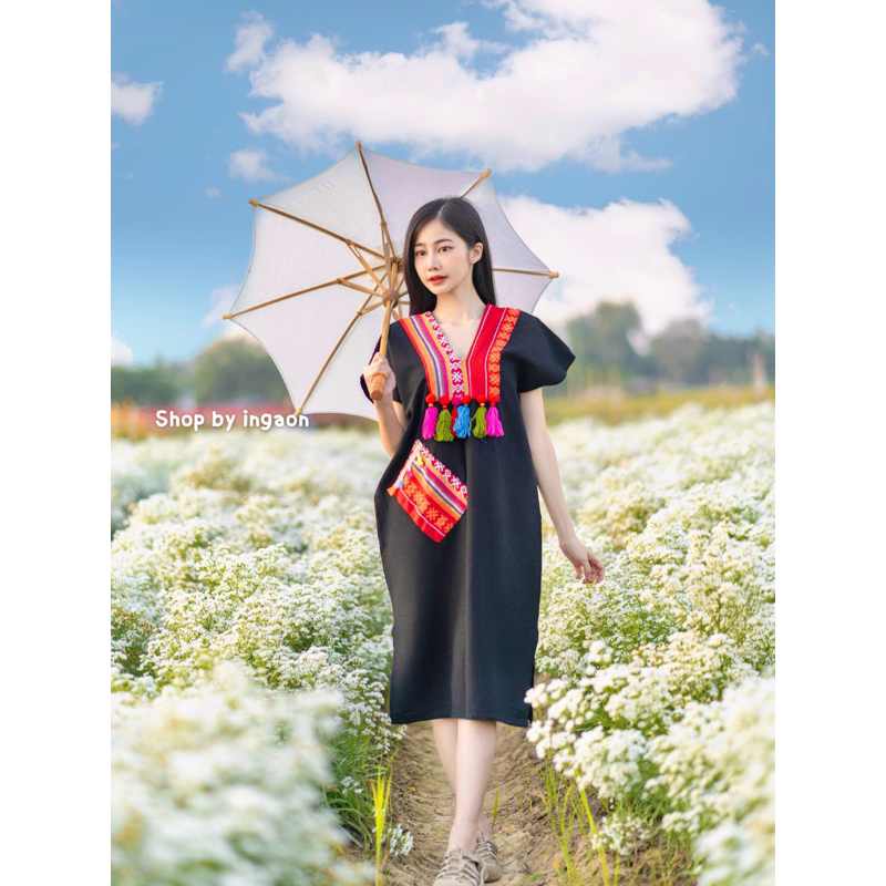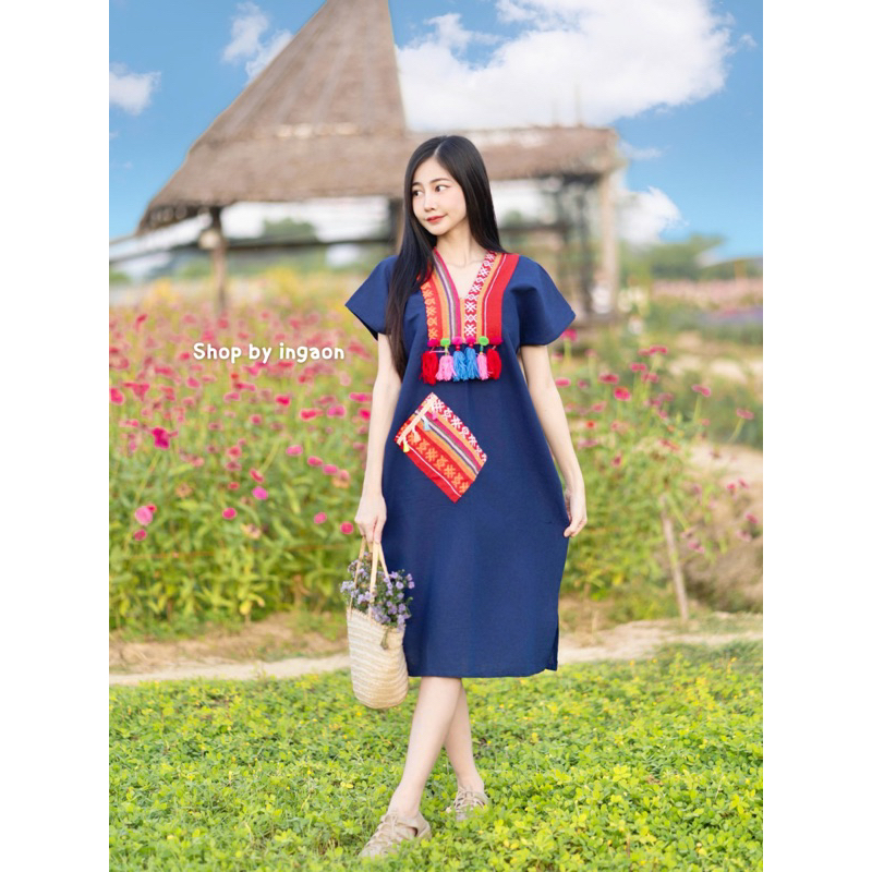 ชุดเดรสพื้นเมืองคอวี ชุดดอย(รุ่นเเต่งผ้านากา+พู่)
