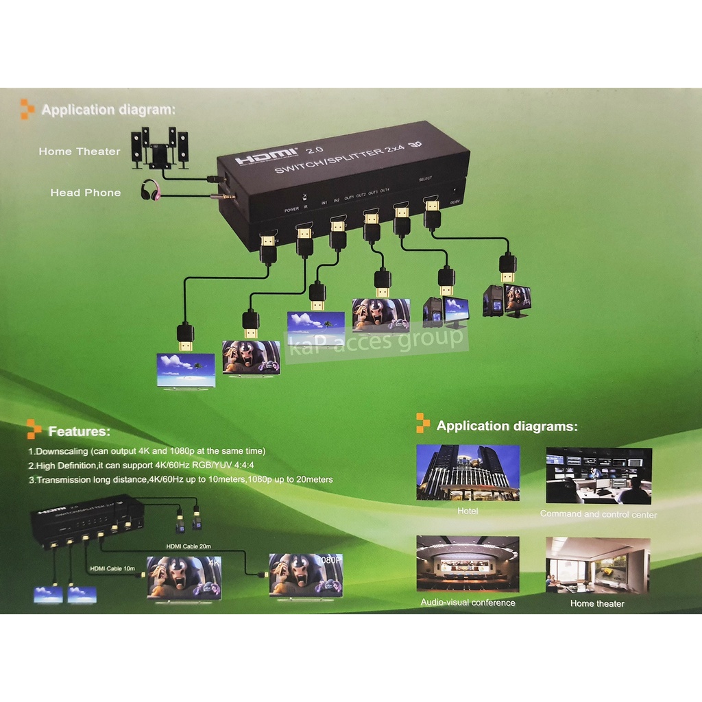 HDMI Splitter / Switch 2x4 ( เข้า2ออก4จอ ) HDMI 2.0 Support 3D 4K