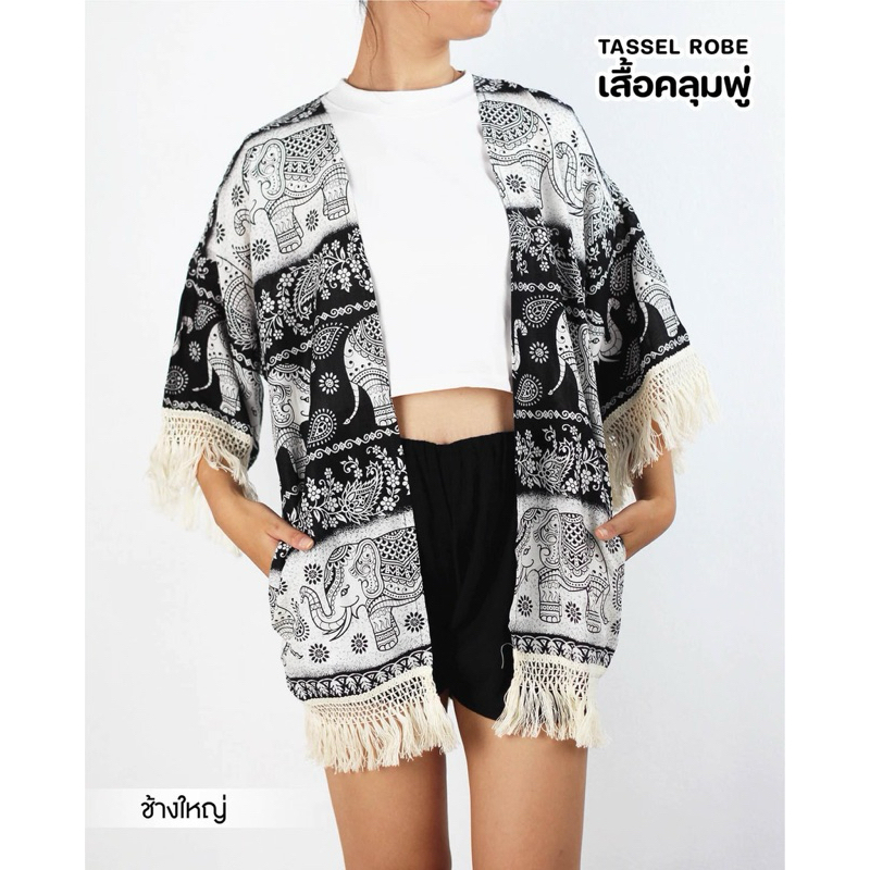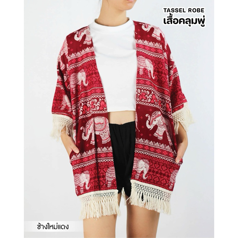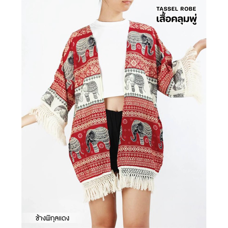 เสื้อคลุมแขนยาว มาพร้อมกับพู่ ลายช้าง ผ้าเรยอน งานไทยแท้💯% สาวเล็ก/สาวอวบใส่ได้
