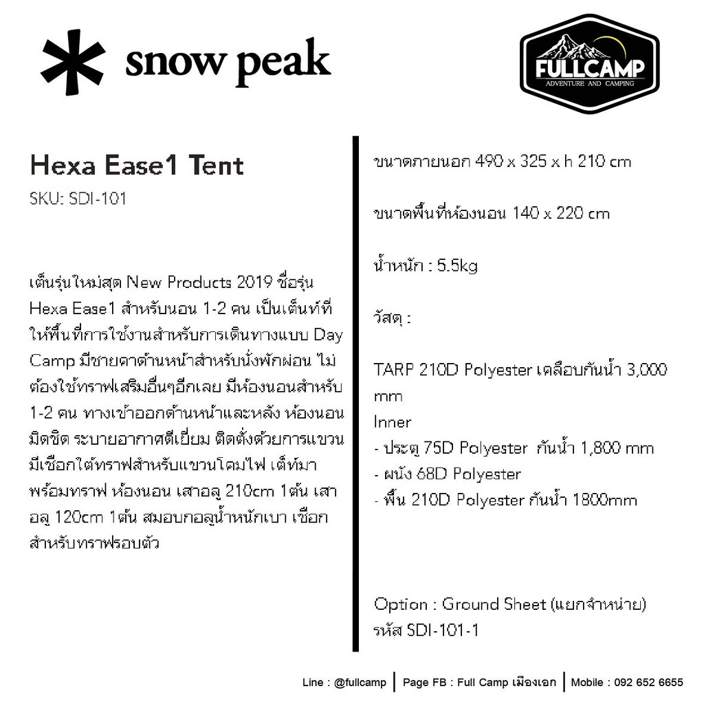 Snow Peak Hexa Ease 1 Tent ชุดเต็นท์พร้อมผ้าใบกันแดด ทาร์ป สำหรับ 1-2 คน สายไบคเกอร์ เ ต็นท์และทาร์ป