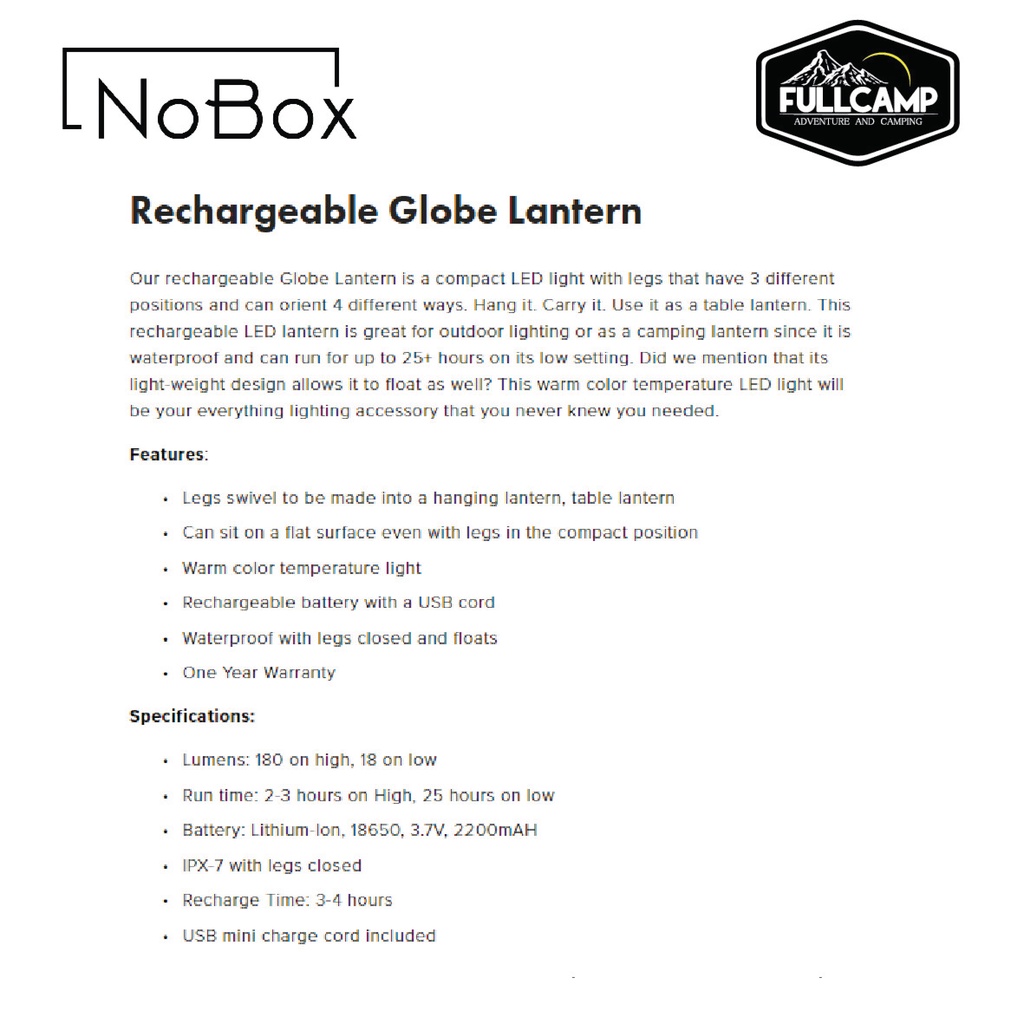 NoBox Rechargeable Globe Lantern ไฟ LED ที่ปรับขาได้หลากหลายรูปแบบ กันน้ำ