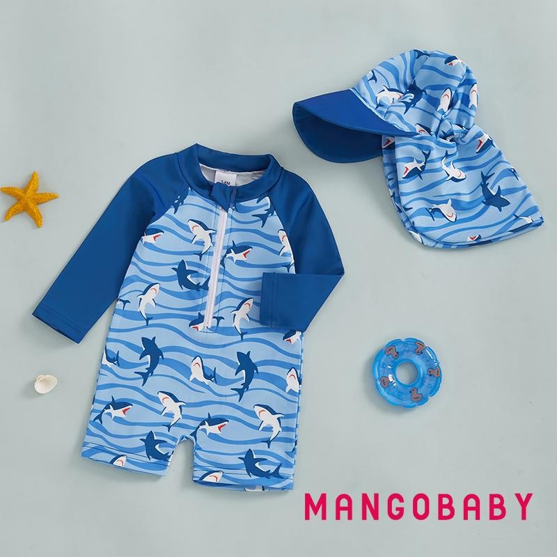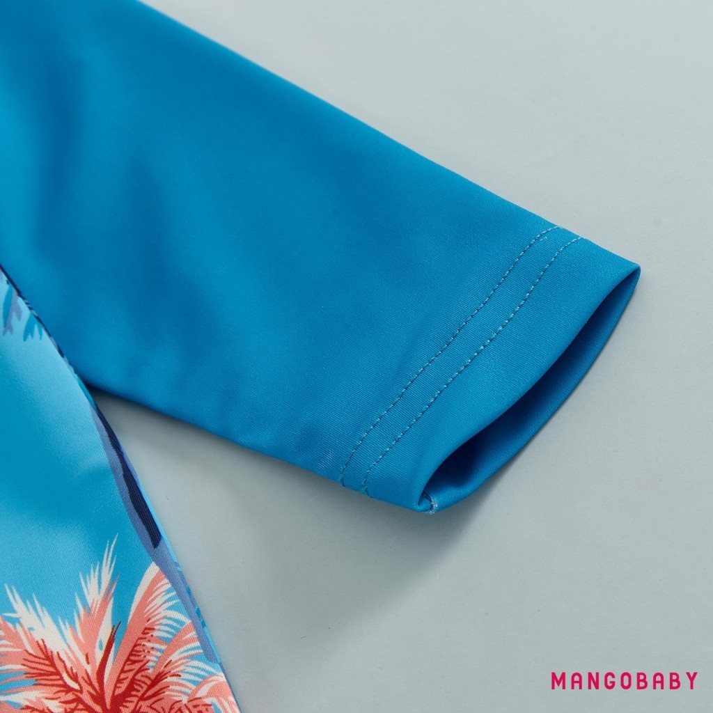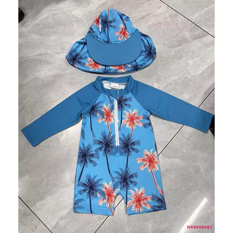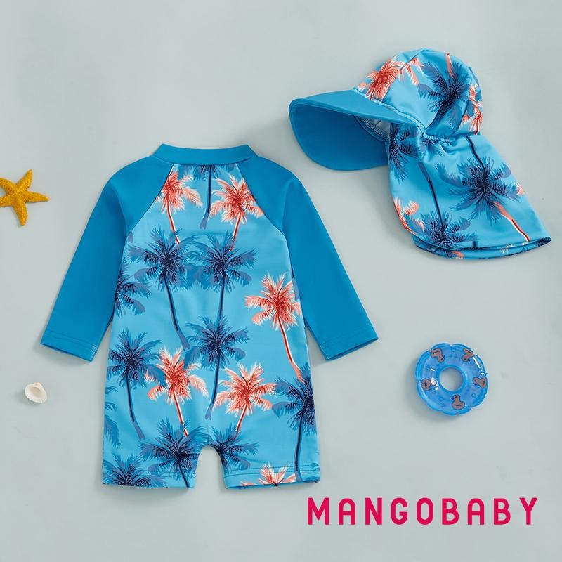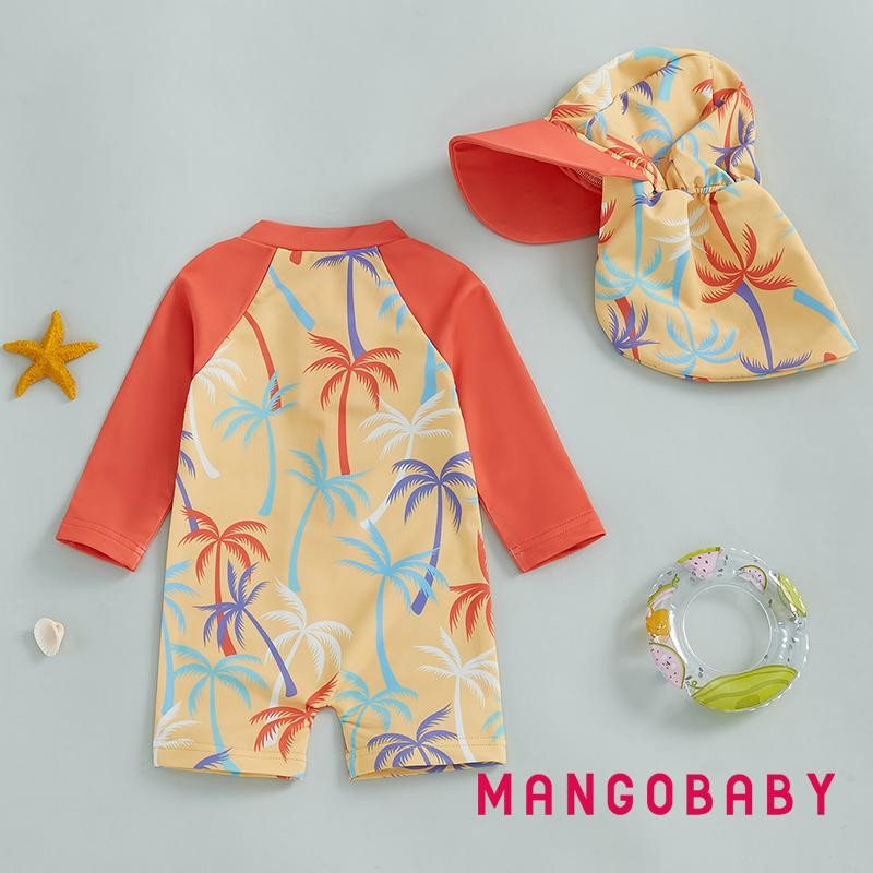 Mg-toddler Boys Rash Guard ชุดว่ายน้ําต้นมะพร้าวพิมพ์แขนยาวซิปชุดว่ายน้ําพร้อมหมวกว่ายน้ํา