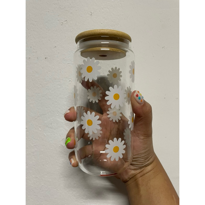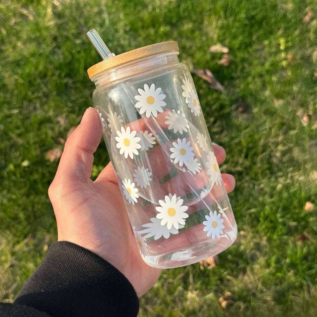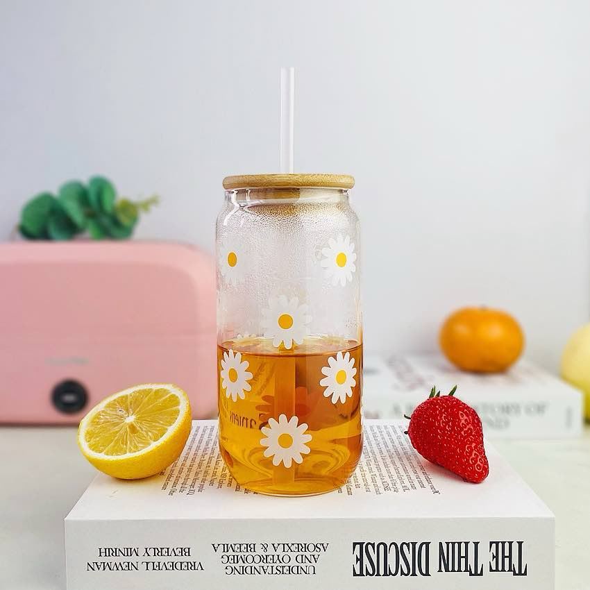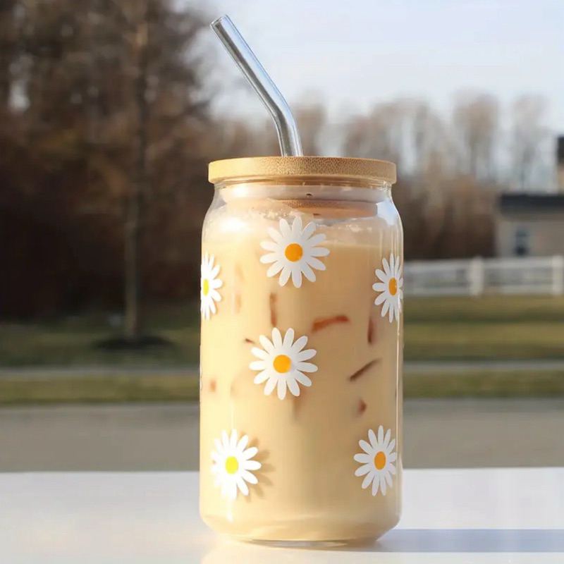 [แตกเคลมฟรี][พร้อมส่ง]🌼 แก้วกลมฝาไม้ ลายดอกเดซี่ แถมหลอด ขนาด 400ml แก้วชาเขียว แก้วกาแฟ โฮมคาเฟ่ แก้วมัทฉะ แก้วดอกไม้