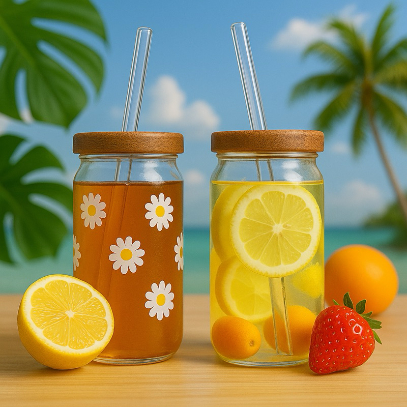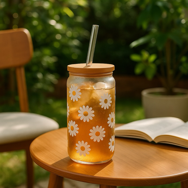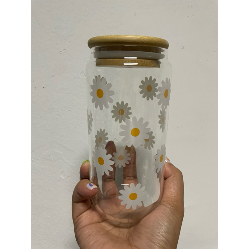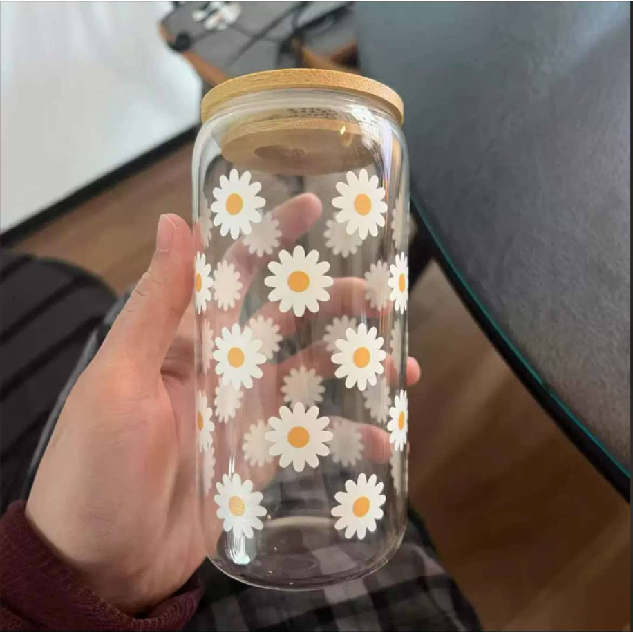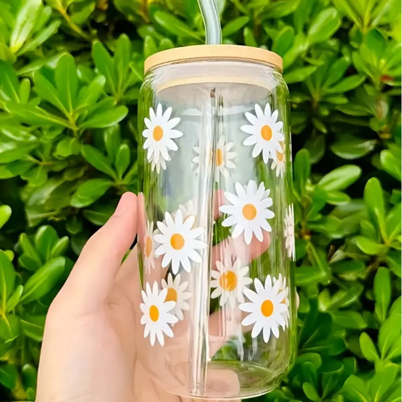[แตกเคลมฟรี][พร้อมส่ง]🌼 แก้วกลมฝาไม้ ลายดอกเดซี่ แถมหลอด ขนาด 400ml แก้วชาเขียว แก้วกาแฟ โฮมคาเฟ่ แก้วมัทฉะ แก้วดอกไม้