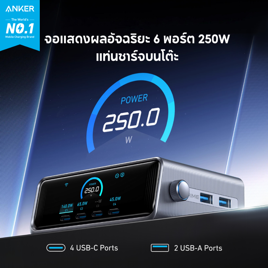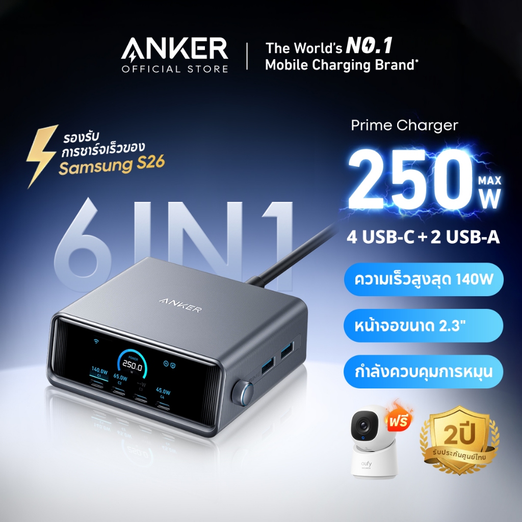 Anker Prime Charger 250W/200W 6-Ports GaN Prime USB-C Charging Station ใช้งานได้กับ Samsung S26/S26 Ultra/iPhone 17/16