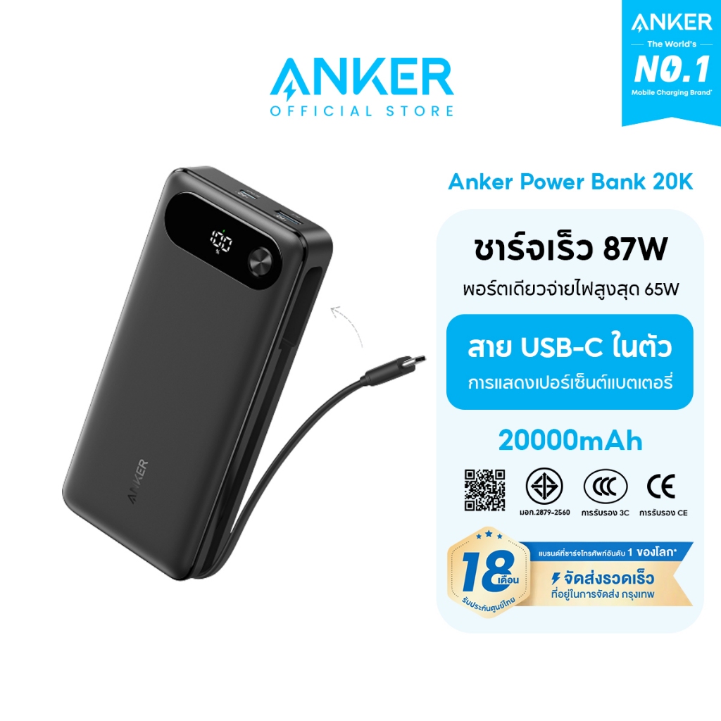 [เครื่องหมาย CCC] ANKER Power Bank 20000mAh with Built-in USB-C Cable 3-Port 87W Max Fast Charging