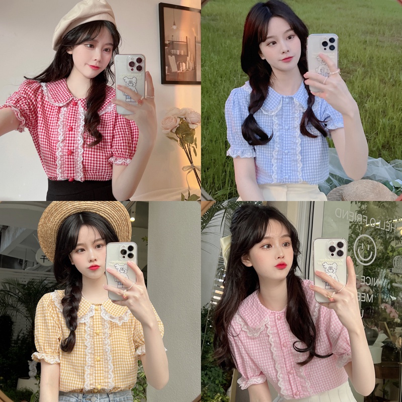 เสื้อเชิ้ตแขนสั้น คอตุ๊กตา ลายสก๊อตน่ารัก แฟชั่นฤดูร้อน สไตล์เกาหลี สําหรับผู้หญิง