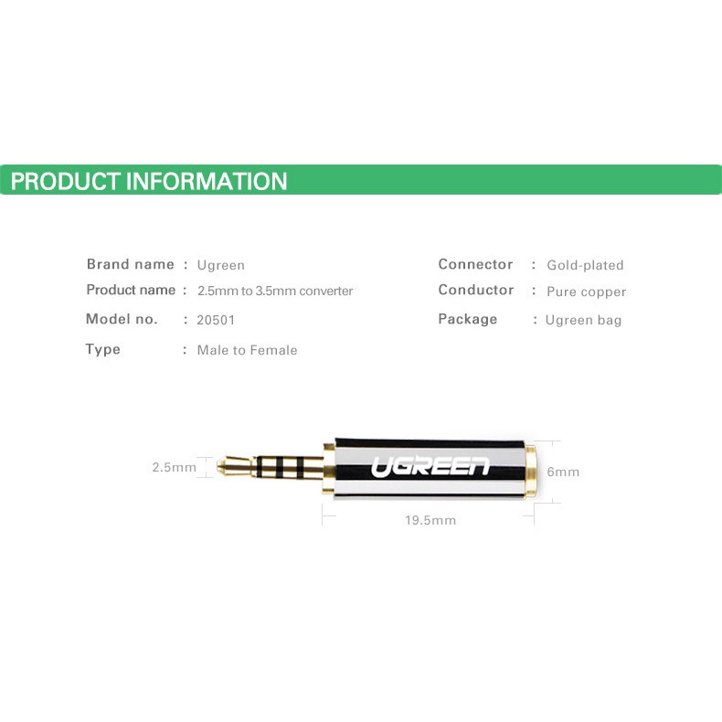 Ugreen(20501) 2.5mm Male to 3.5mm Female Stereo Audio Headphone Adapter Connector Converter For iPhone Mobile Phone