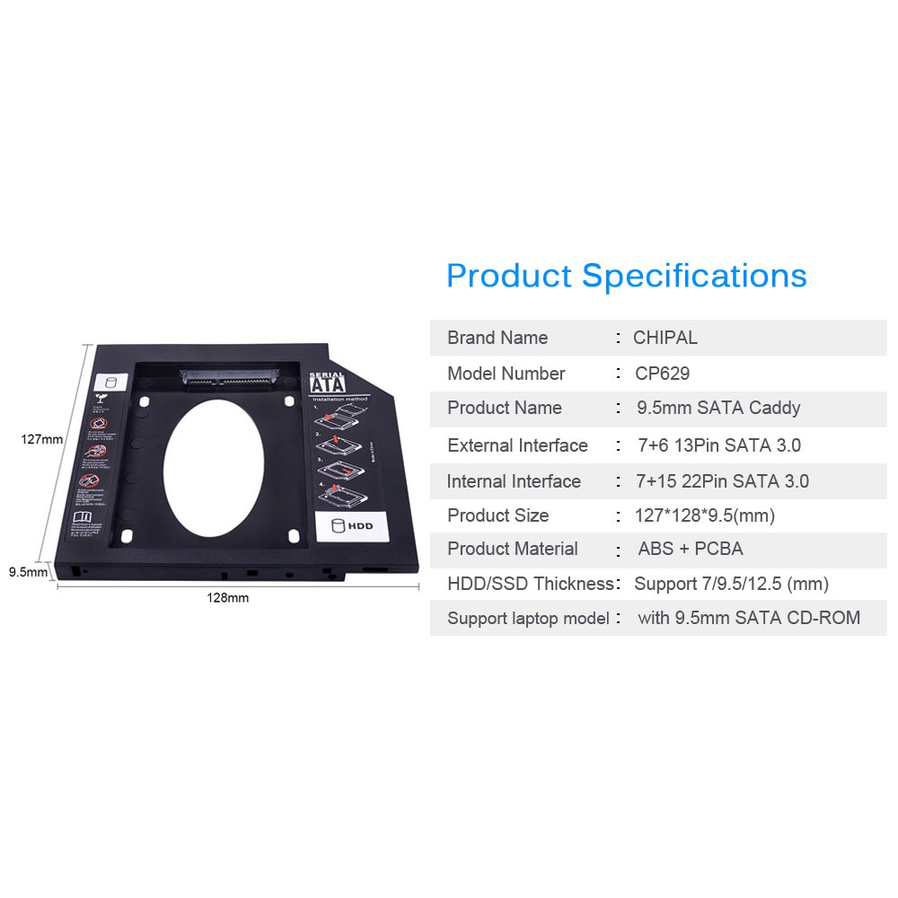 (CP629) CHIPAL Universal 2nd HDD Caddy 9.5mm SATA 3.0 for 2.5'' 9mm 7mm SSD HDD Case For Laptop CD DVD ROM Optibay