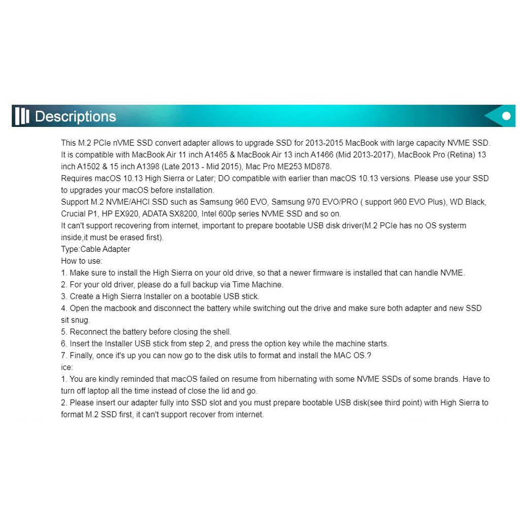 (สำหรับMacเท่านั้น)M.2 NVME SSD Convert Adapter Card for MacBook Air Pro Retina 2013-2017 for A1465 A1466 A1398 A1502