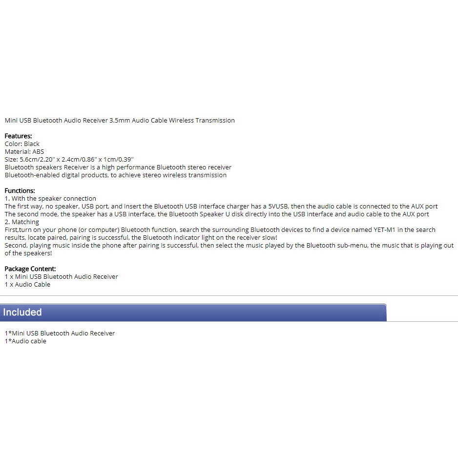 USB Bluetooth Audio Receiver 3.5mm Audio Cable Black Wireless