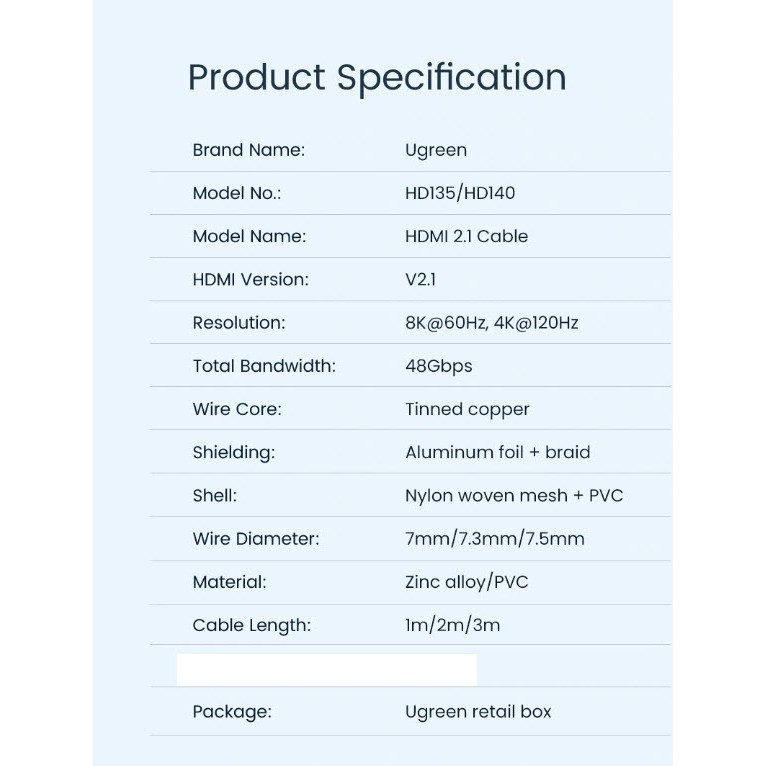 (HDMI 2.1)Ugreen HDMI 2.1 8K/60Hz 4K/120Hz 48Gbps HDCP2.2 (Luxury Zinc Alloy/ PVC Delicate Model)(HD135/HD140)
