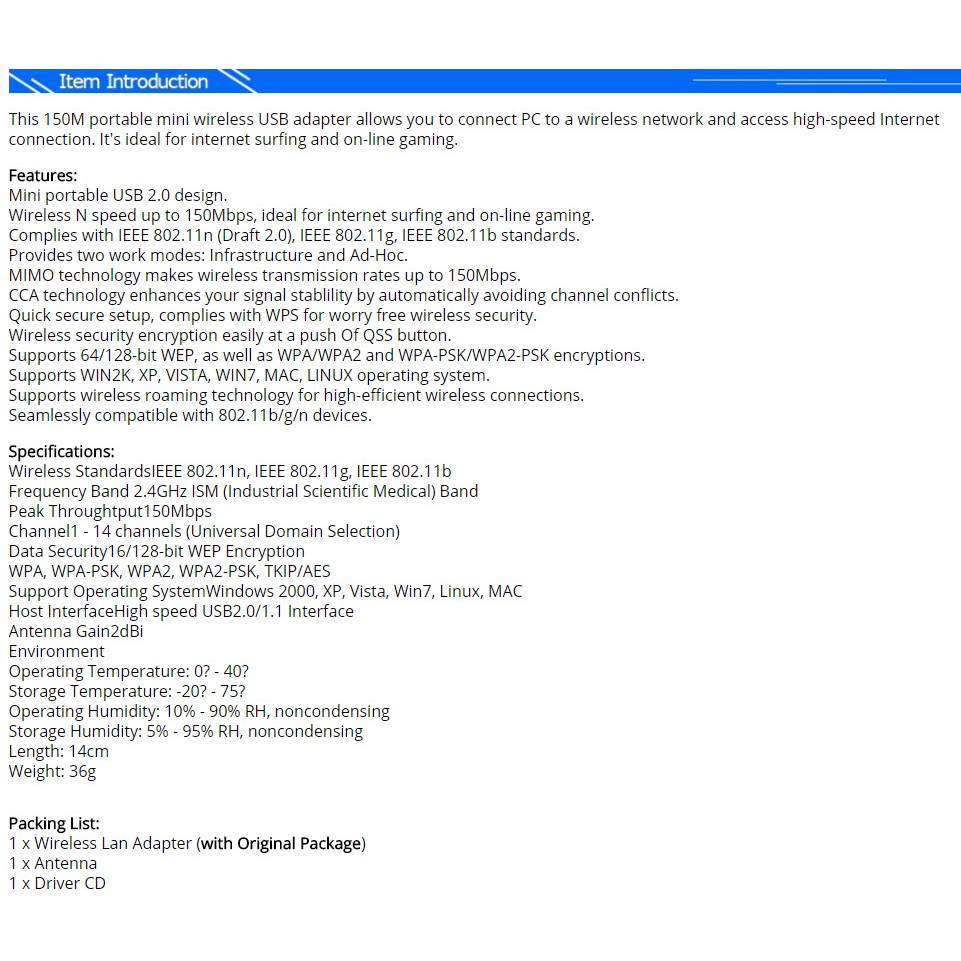 150M USB WiFi Adapter + เสา2dBi พร้อมแผ่นDriver Wireless LAN Network Card 802.11n/g/b for Win XP, Vista, 7, 8,10