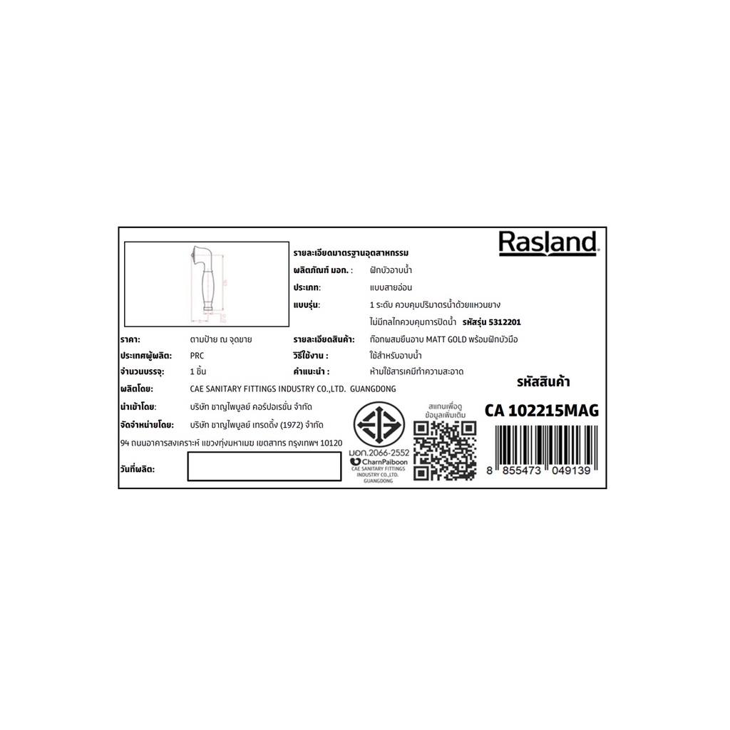 RASLAND ก๊อกผสมยืนอาบ MATT GOLD พร้อมฝักบัวมือ | CA 102215MAG