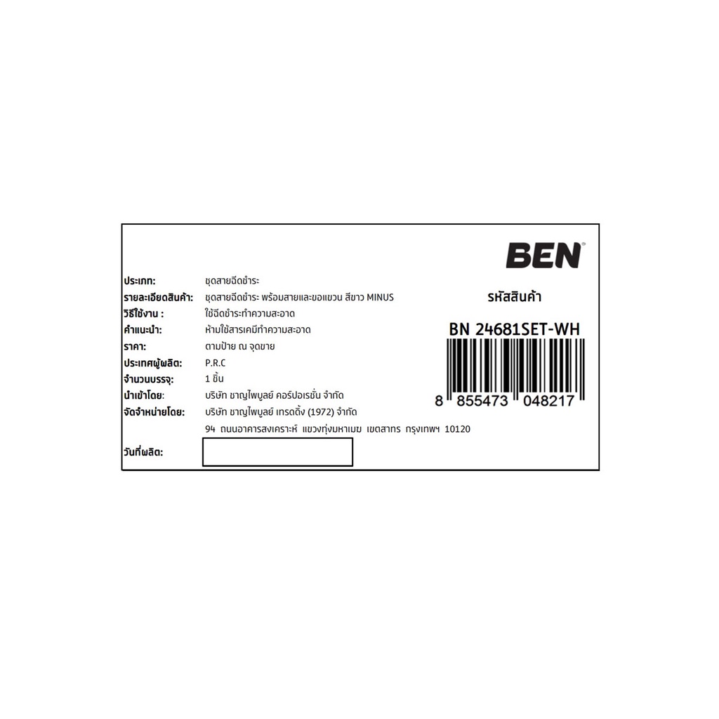 BEN ชุดสายฉีดชำระ พร้อมสายและขอแขวน สีขาว MINUS BN 24681SET-WH