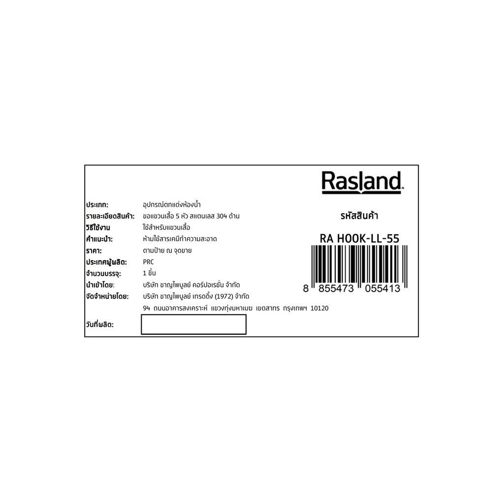 RASLAND ขอแขวนเสื้อ 5 หัว สแตนเลส 304 ด้าน RA HOOK-LL-55