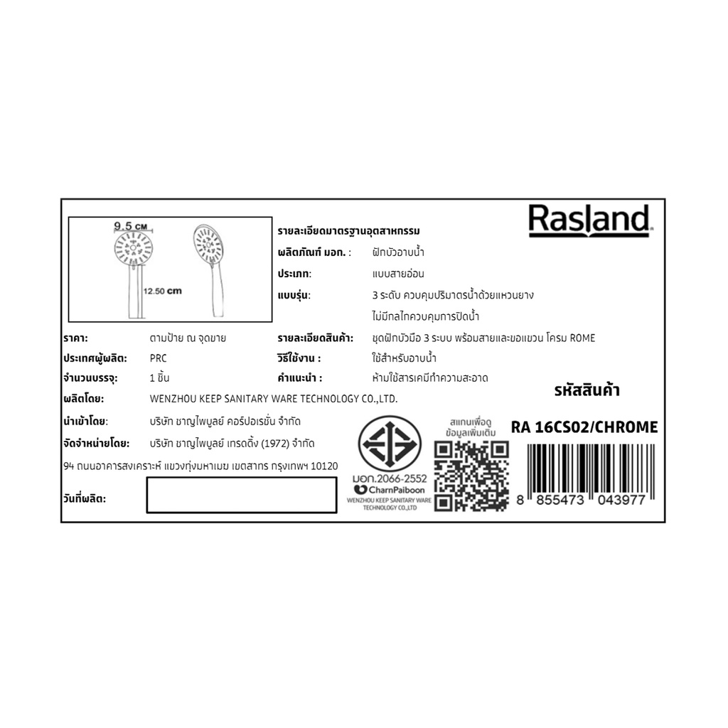 ฝักมื อบัว พลาสติก ABS พร้อมสายและขอแขวนครบชุด RASLAND สายฝักบัวขนาด 1.50 ซม หัวฝักบัวปรับน้ำได้ 3 ระบบ | RA 16CS02/CHROM