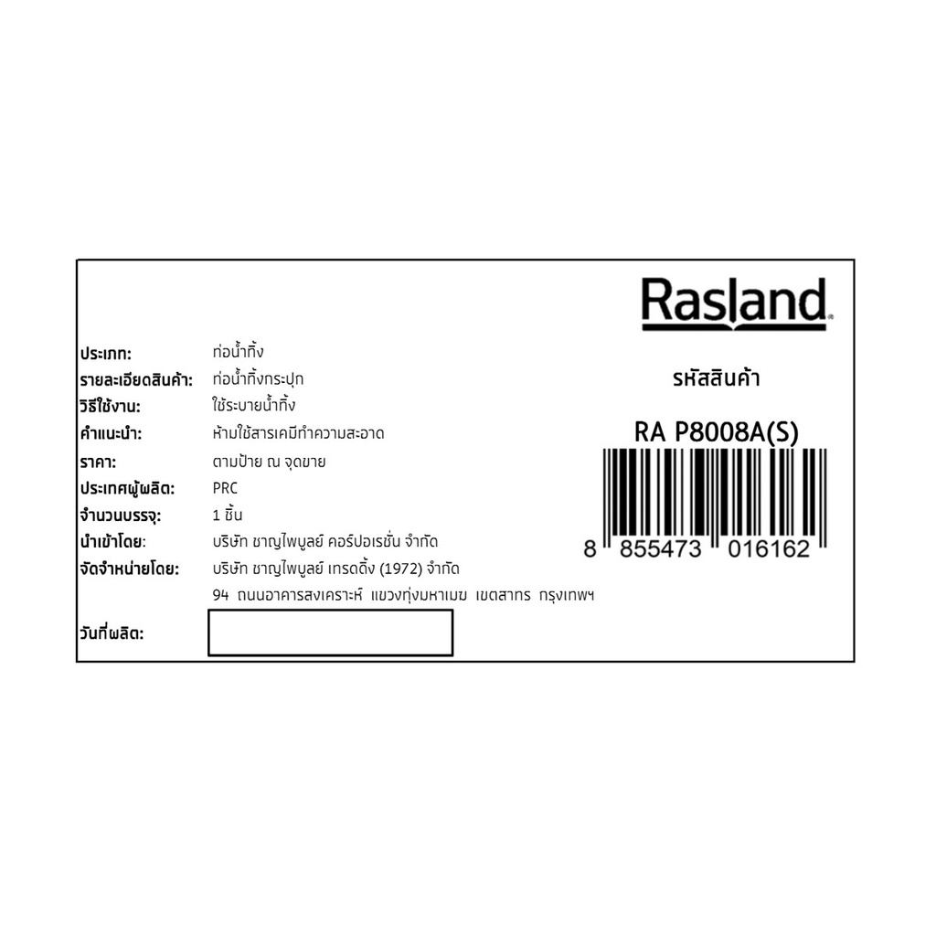 RASLAND ท่อน้ำทิ้งกระปุก ท่อออกจากกำแพงยาว 20 cm. RA P8008A(S)