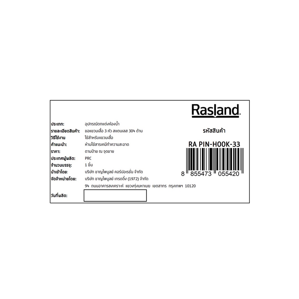 RASLAND ขอแขวนเสื้อ 3 หัว สแตนเลส 304 ด้าน RA PIN-HOOK-33