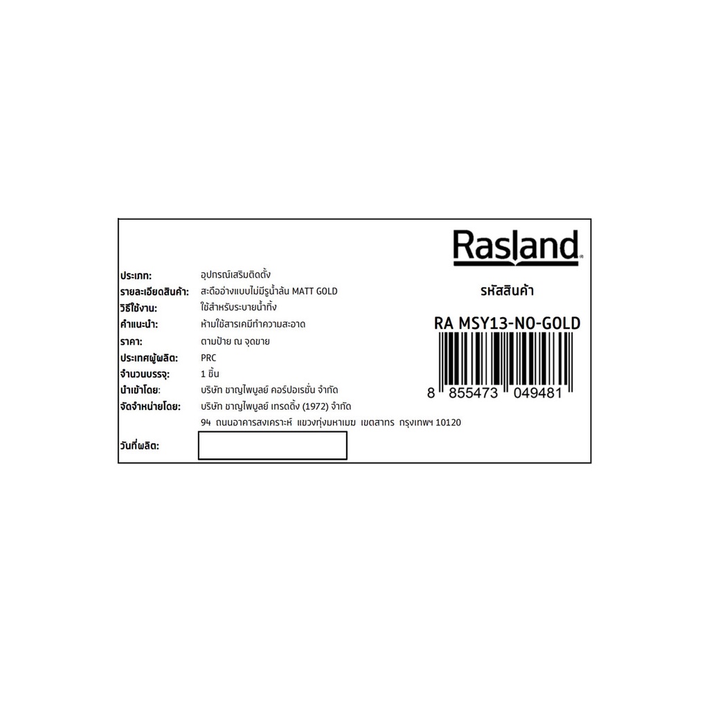 RASLAND สะดืออ่างแบบไม่มีรูน้ำล้น MATT GOLD | RA MSY13-NO-GOLD