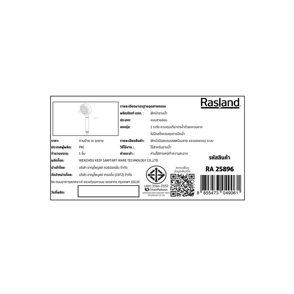 RASLAND ฝักบัวมือสแตนเลสพร้อมสาย และขอแขวน1ระบบ RA 25896