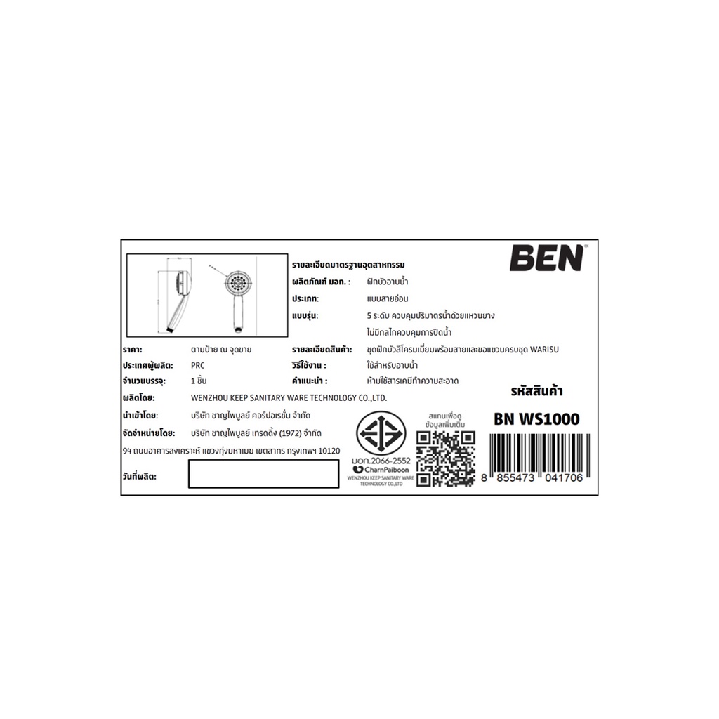 BEN ชุดฝักบัวสีโครมเมียม ปรับน้ำได้ 5 ระบบ มีระบบพิเศษพร้อมสายและขอแ ขวนครบชุด