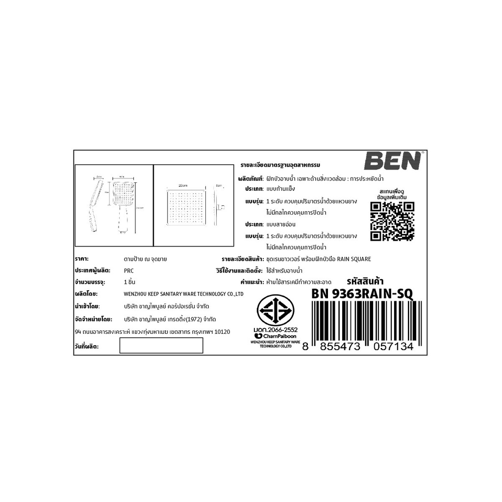 BEN ชุดเรนชาวเวอร์ พร้อมฝักบัวมือ RAIN SQUARE BN 9363RAIN-SQ
