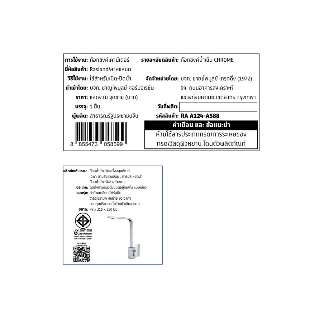 ก๊อกสำหรับอ่างซิ้งค์ น้ำเย็น สีโครเมียม / สีดำด้าน สำหรับติดตั้งอ่างซิ้งค์ สามารถใช้ได้กับซิงค์ทุกยี่ห้อ| RA A124-A588