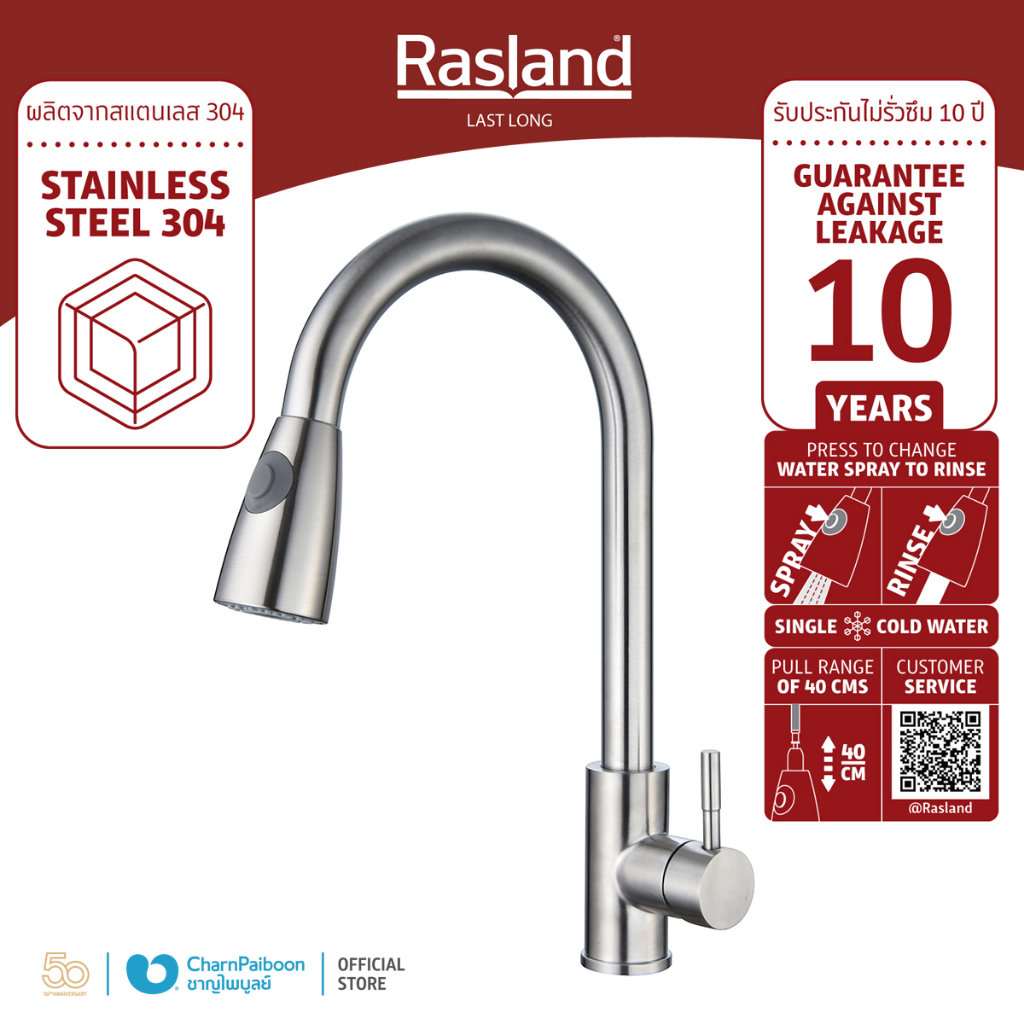 ก๊อกอ่างล้างจาน สแตนเลส RASLAND ปากก๊อกดึงยืดออกได้ ปรับน้ำได้ 2 ระบบ รับประกันไส้วาล์ว 10 ปี | RA PROUD-999