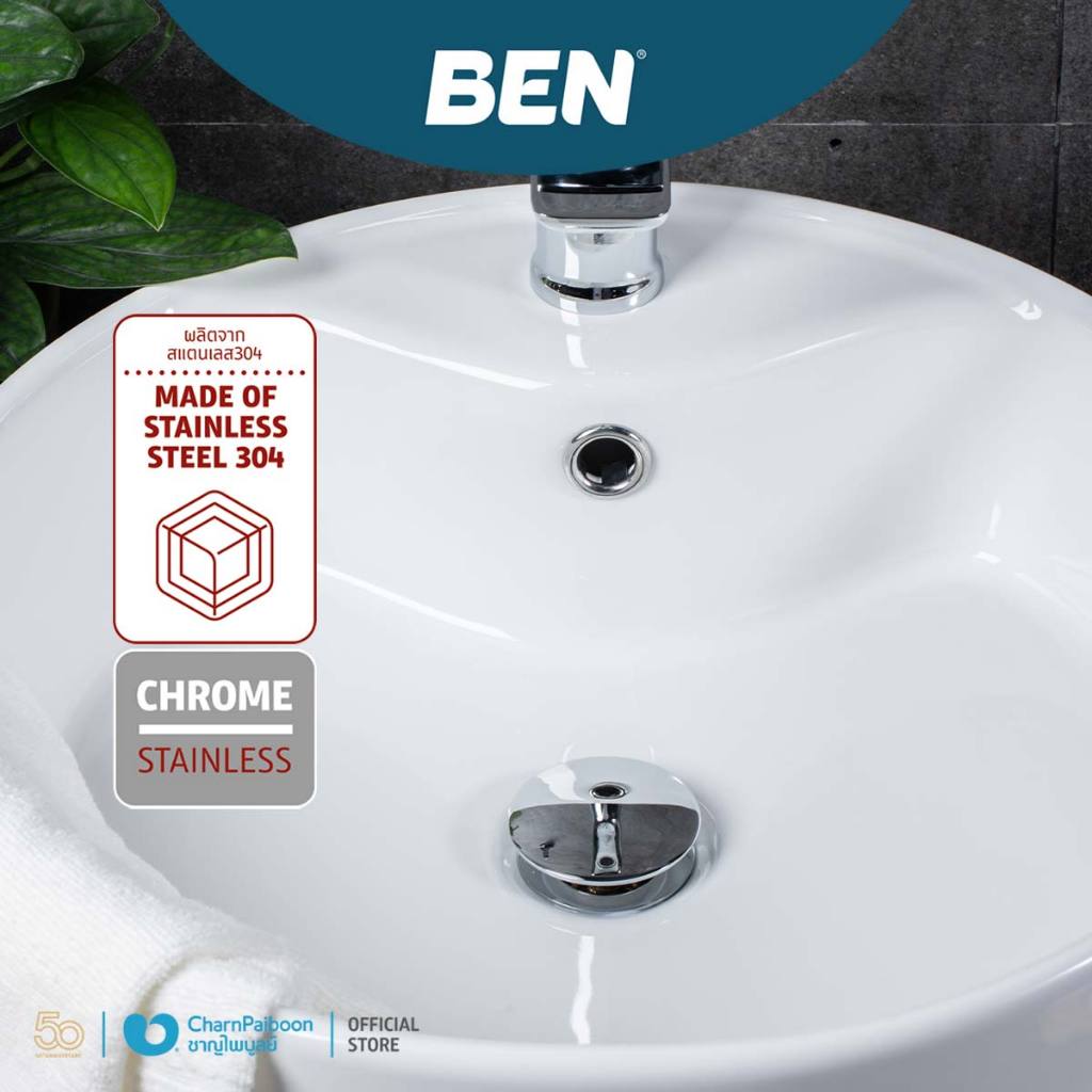 สะดืออ่างล้างหน้า แบบแป้นกดใหญ่ สำหรับอ่างมีรูน้ำล้น สแตนเลส304 โครเมียมเงา ใช้งานกดเพื่อปล่อยน้ำทิ้ง | BN K111-BG-22CHR