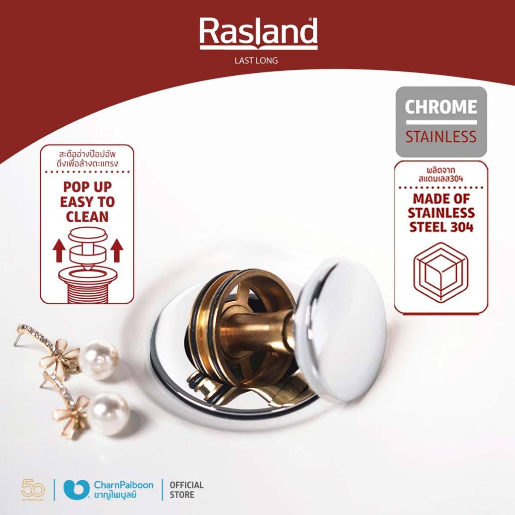 สะดืออ่างล้างหน้า แบบแป้นกดเล็ก สำหรับอ่างมีรูน้ำล้น สแตนเลส 304 สีโครเมียมเงา ดึงแกนขึ้นทำความสะอาดได้ | RA K111-K1516